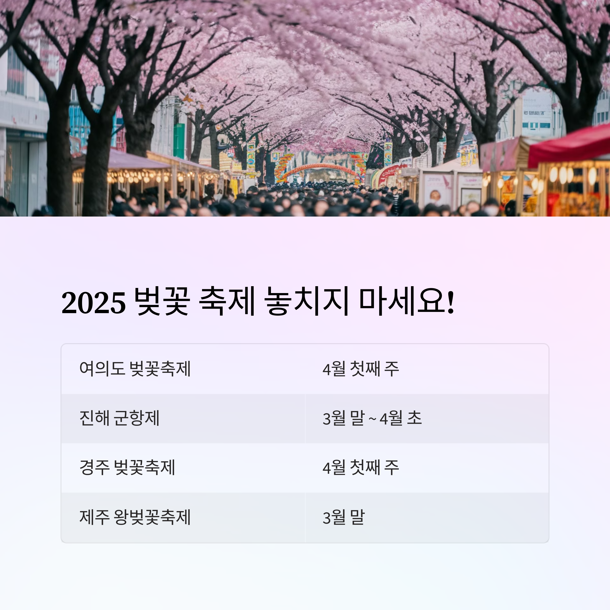 | 진해 군항제 | 경남 창원 | 2025년 3월 27일 ~ 4월 7일 | 대한민국 최대 벚꽃 축제 |