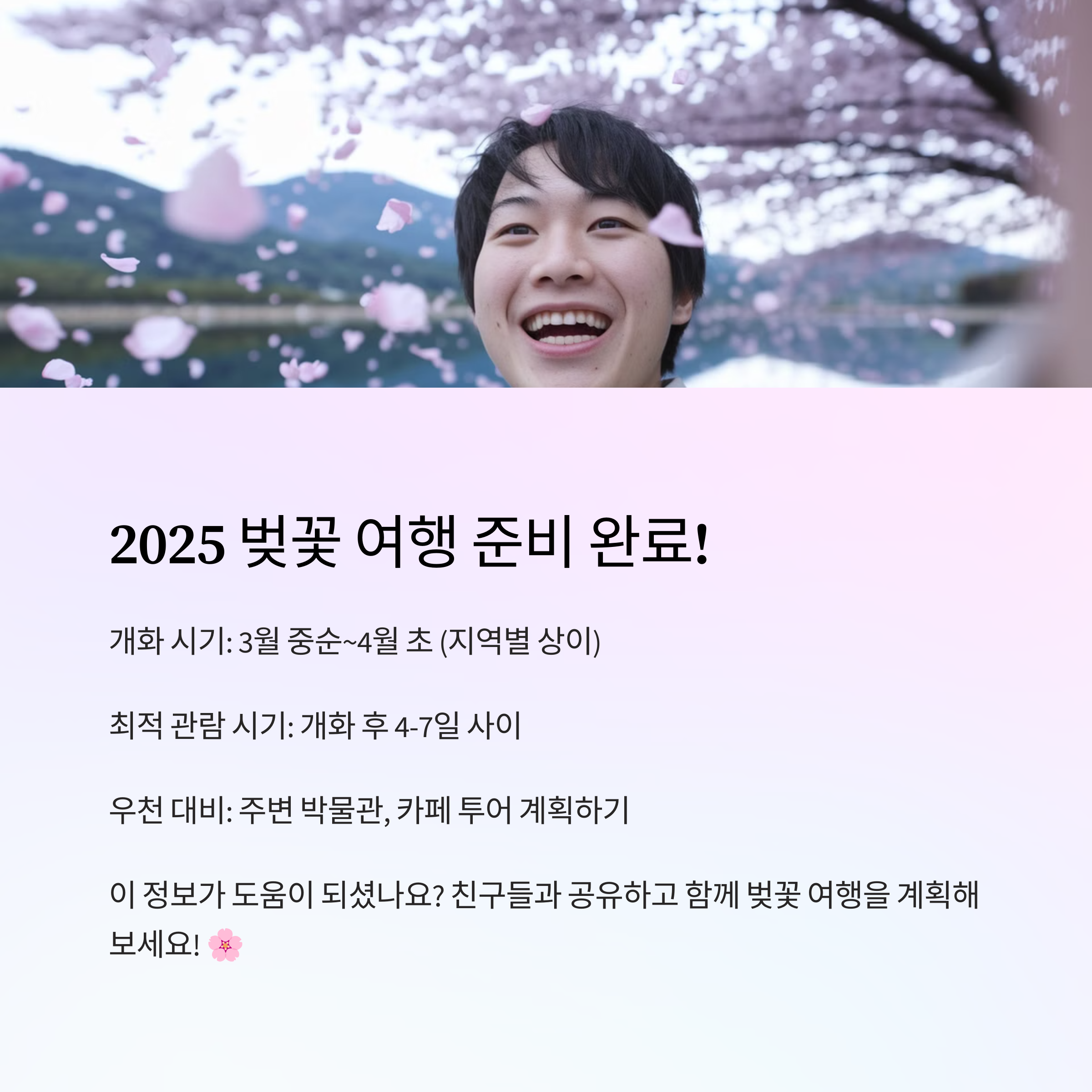 🌸 2025년 벚꽃 여행을 계획하는 분들에게 유용한 정보가 되었길 바라요! 벚꽃과 함께 즐거운 봄날 보내세요! 🚗✨