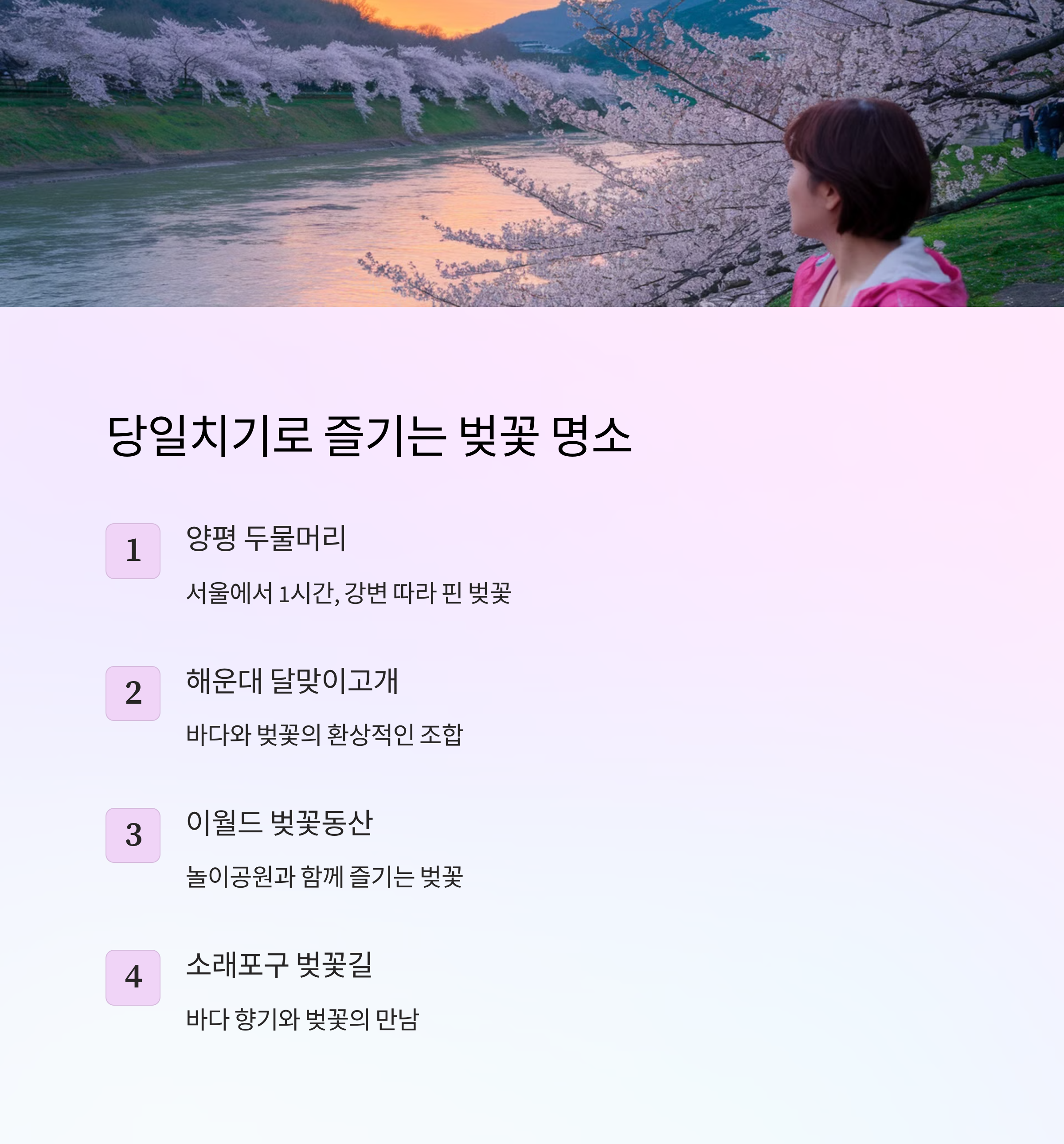 바쁜 일상 속에서도 하루만 시간을 내어 벚꽃을 즐길 수 있는 당일치기 여행지는 참 많아요. 서울, 경기, 충청, 전라도, 경상도 등 지역별로 쉽게 다녀올 수 있는 명소를 소개할게요! 🚗