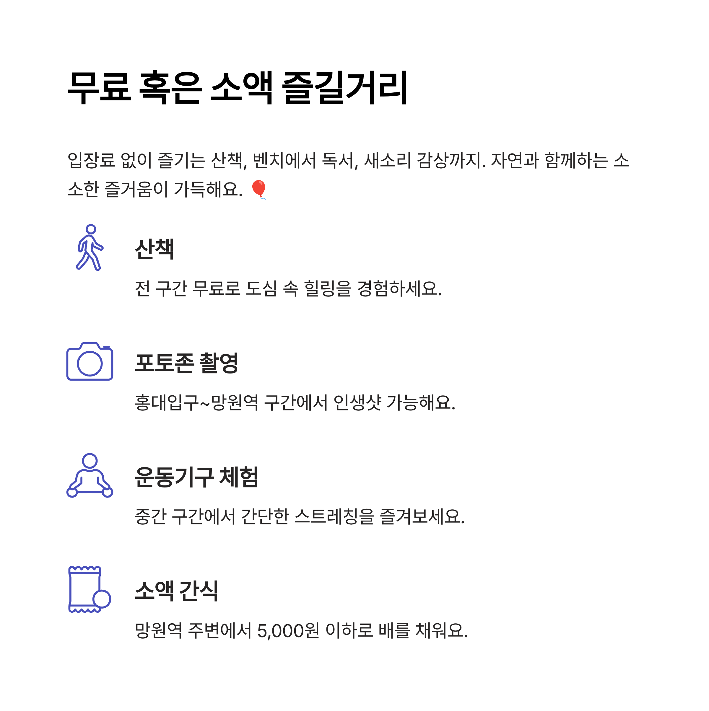 | 포토존 촬영 | 무료 | 홍대입구~망원역 | 인생샷 가능 |