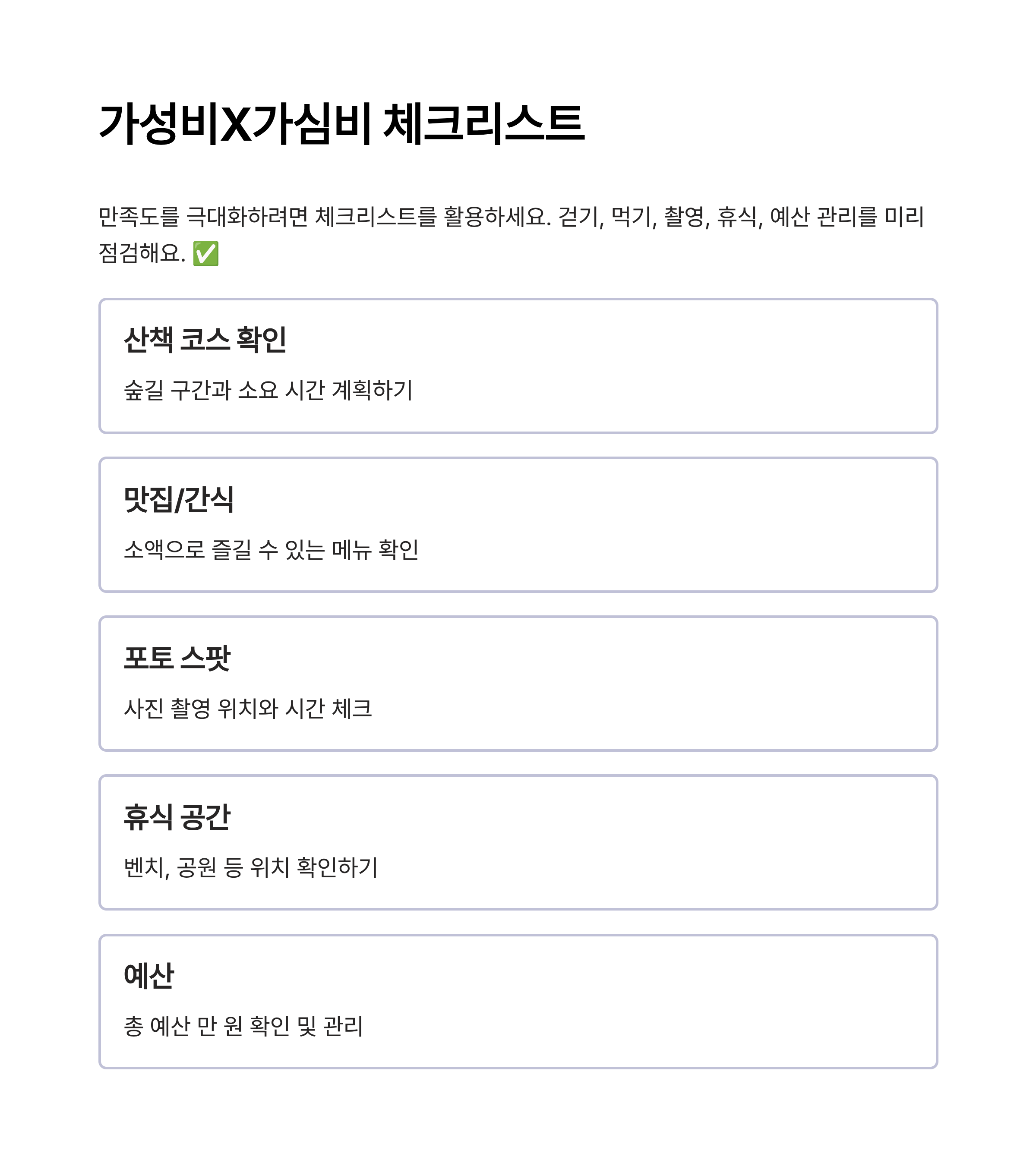 이 체크리스트를 활용하면 걷기, 식사, 촬영, 휴식을 균형 있게 즐길 수 있어요. 연인과 함께 확인하며 체크하면 만족도가 훨씬 높아요.
