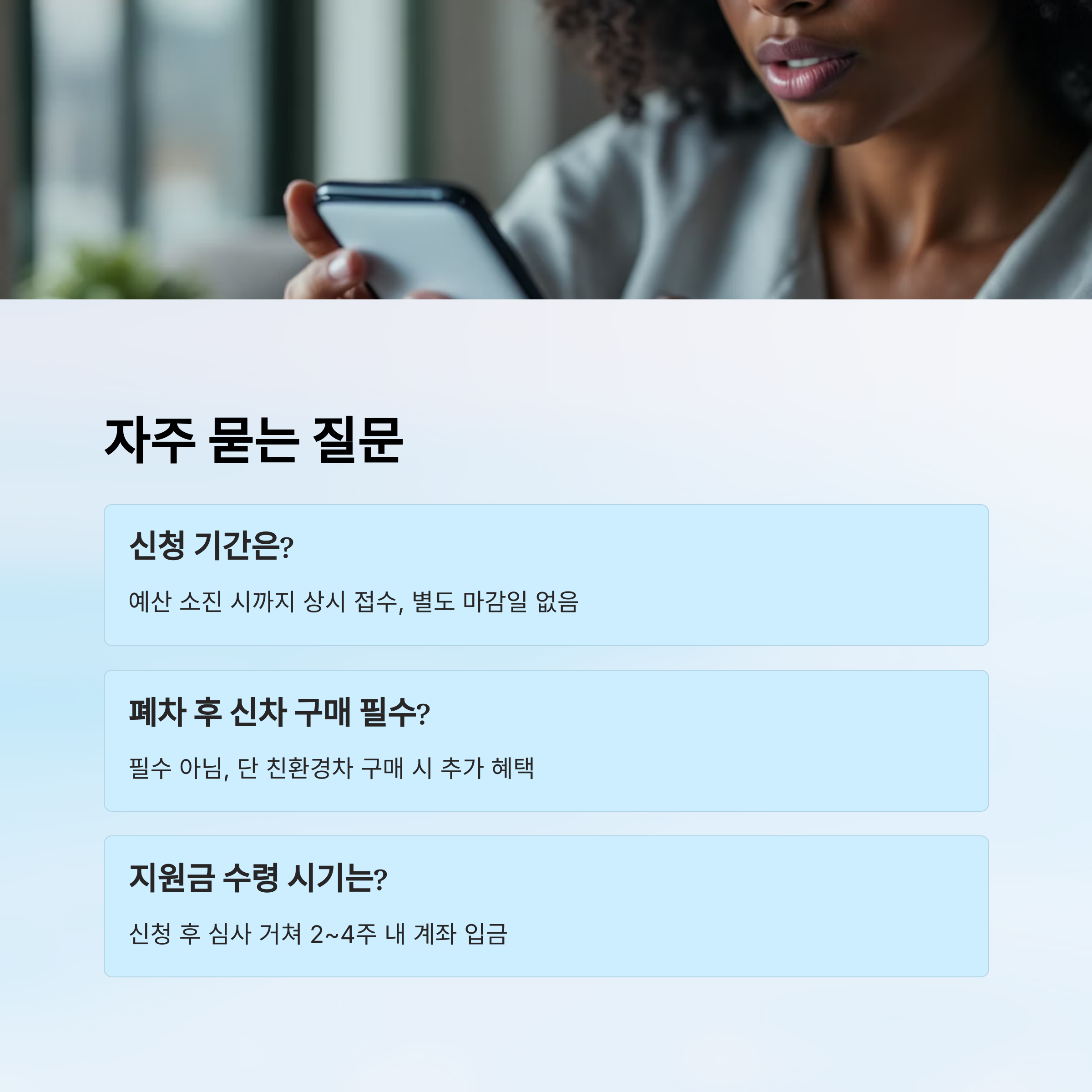 A2. 아니에요! 폐차만 해도 지원금이 지급돼요. 하지만 친환경차(전기차, 수소차, 1·2등급 차량)를 구매하면 추가 지원금을 받을 수 있어요. 꼭 신차를 사야 하는 건 아니지만 혜택이 더 커진답니다.