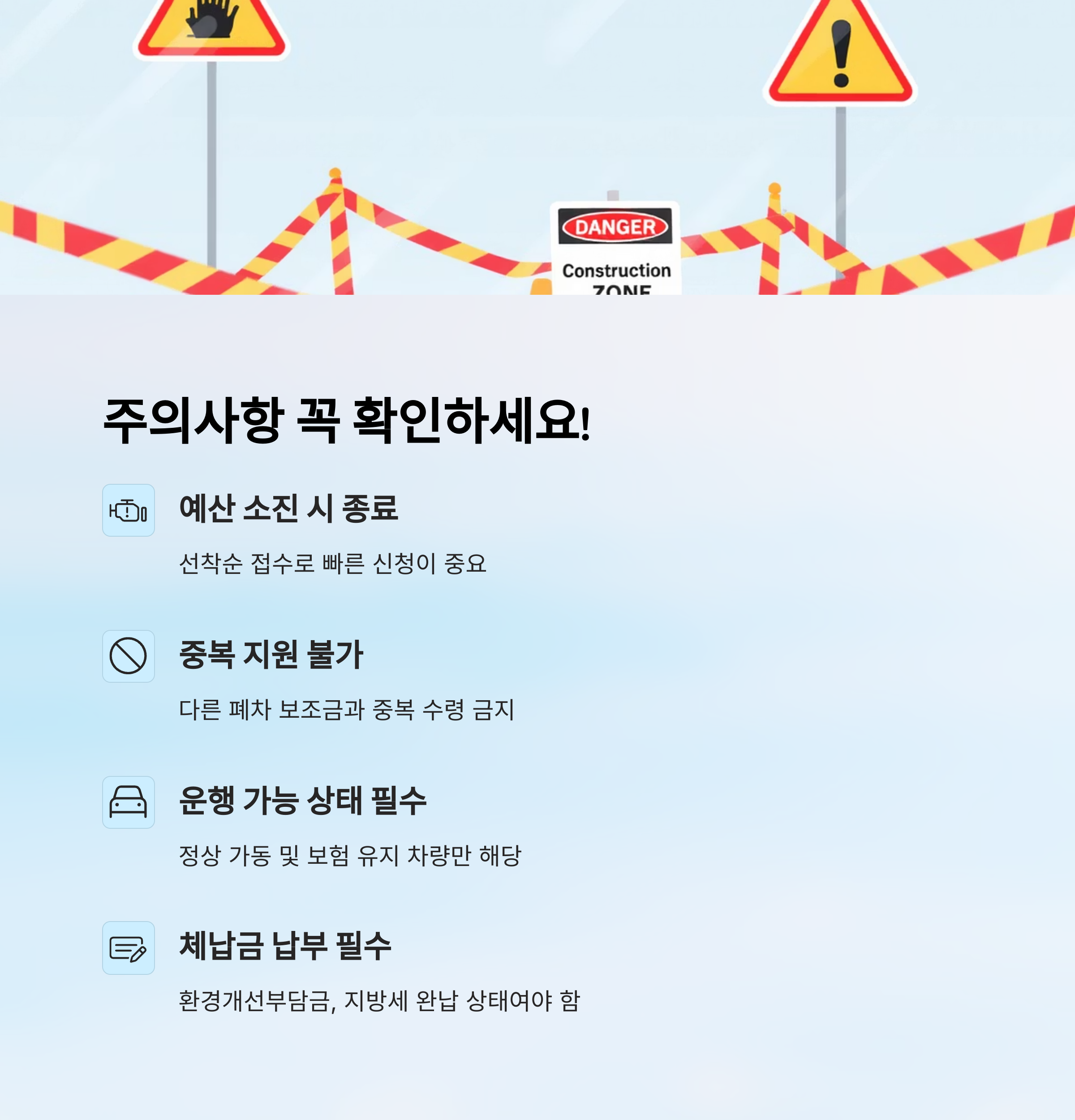 또 하나 유의할 점은 중복 지원 금지예요. 이미 다른 폐차 보조금이나 친환경차 보조금을 받은 경우 중복 신청이 안 될 수 있어요. 반드시 자격 요건을 다시 확인해야 해요.