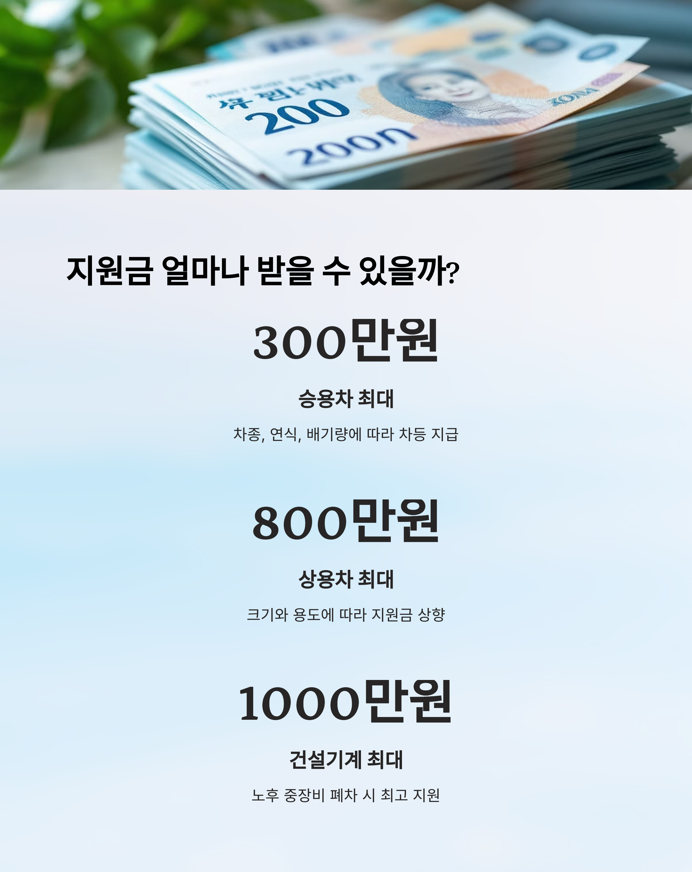 지원금은 차량의 차종, 연식, 배기량, 차령 등에 따라 달라져요. 일반적으로 경차보다는 중형차, 중형차보다는 대형 상용차에 더 많은 금액이 지급돼요. 📊