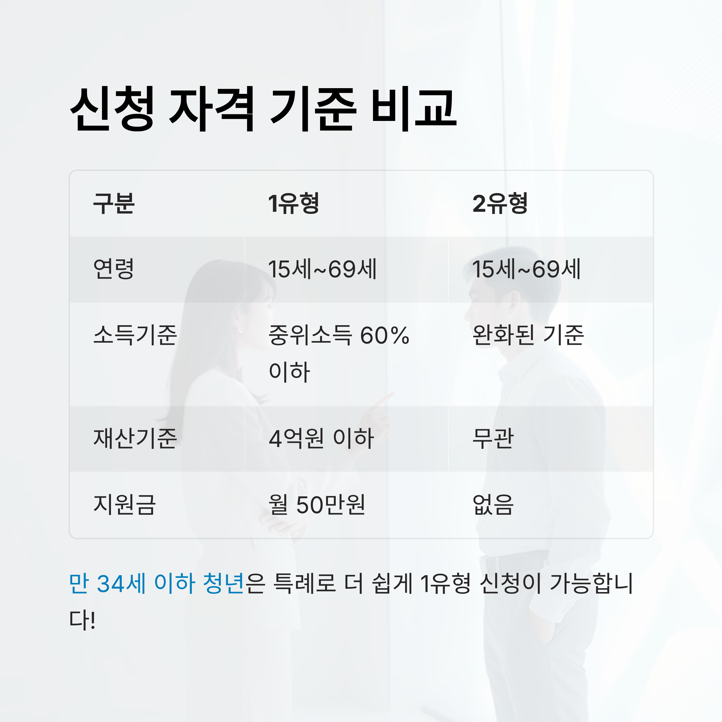 특히 만 34세 이하의 청년 구직자는 ‘청년특례’로 보다 간단하게 1유형으로 신청이 가능해요. 청년은 기준이 조금 더 완화되니 꼭 챙겨보세요. 💼