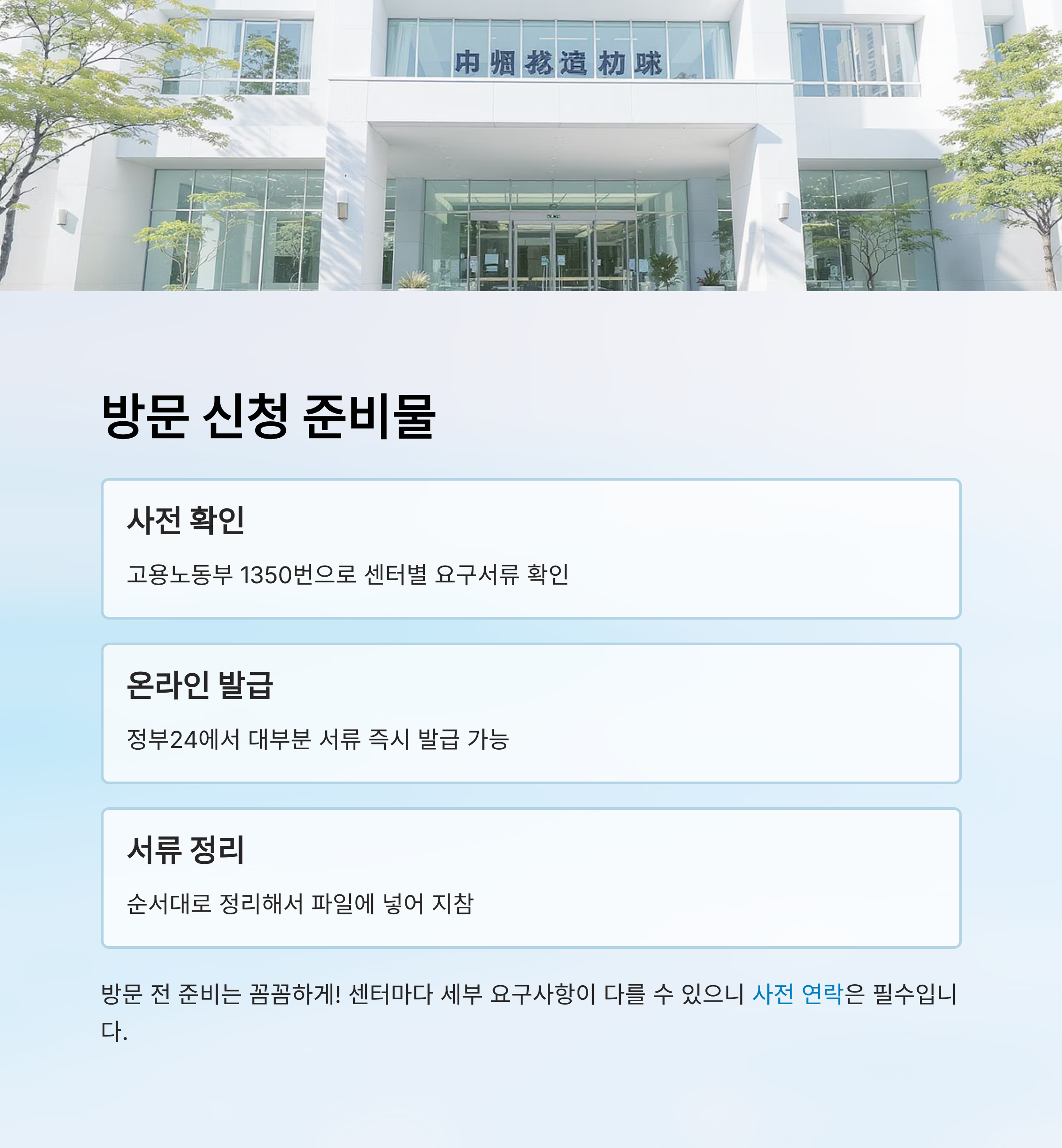 센터를 방문하기 전에 고용노동부 고객센터 1350번이나 고용24(www.work24.go.kr)에서 내가 가는 센터에 전화해보는 게 가장 좋아요. 센터마다 요구하는 세부 서류가 다를 수 있어서 사전 확인이 매우 중요하답니다. 📞