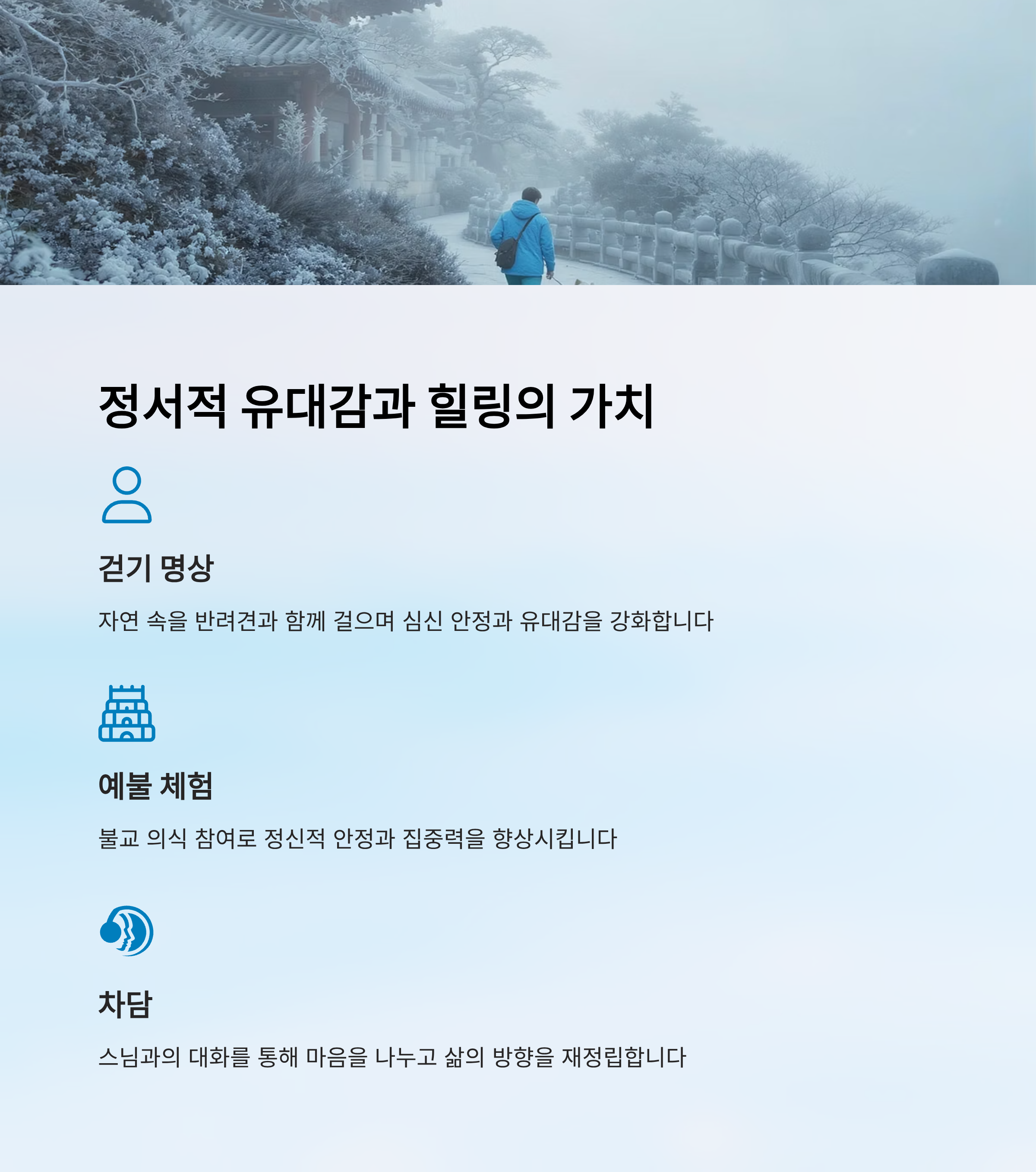 | 사찰 산책 | 반려견과 함께하는 조용한 산책 | 일상 스트레스 해소 |