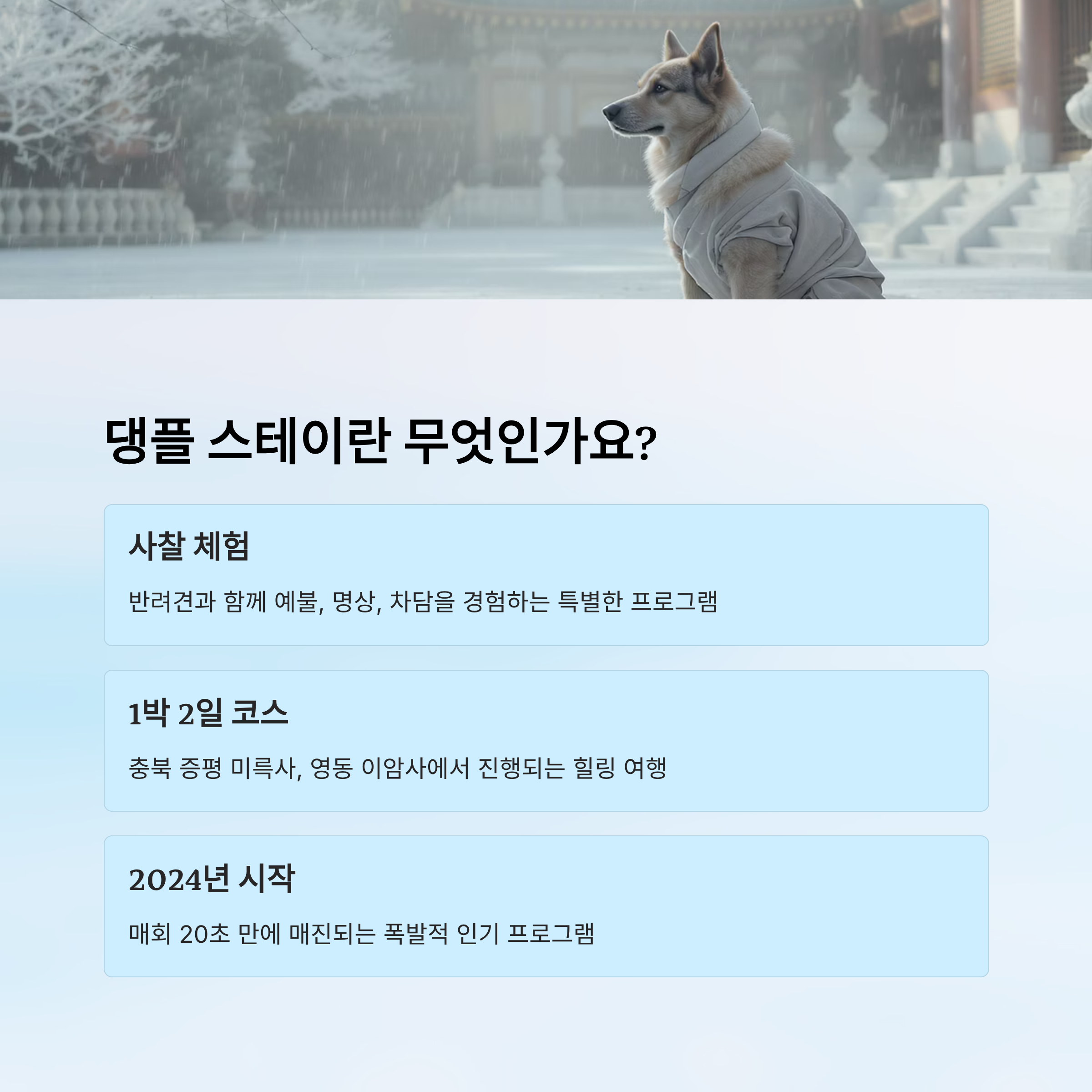 이에 따라 ‘웨이팅 리스트’, ‘시즌별 테마 운영’, ‘타지역 사찰 확대’ 같은 전략적 대응이 필요해 보여요. 댕플 스테이를 기대하고 있는 많은 보호자들이 다양한 시기와 장소에서 참여할 수 있도록 저변 확대가 필수예요.
