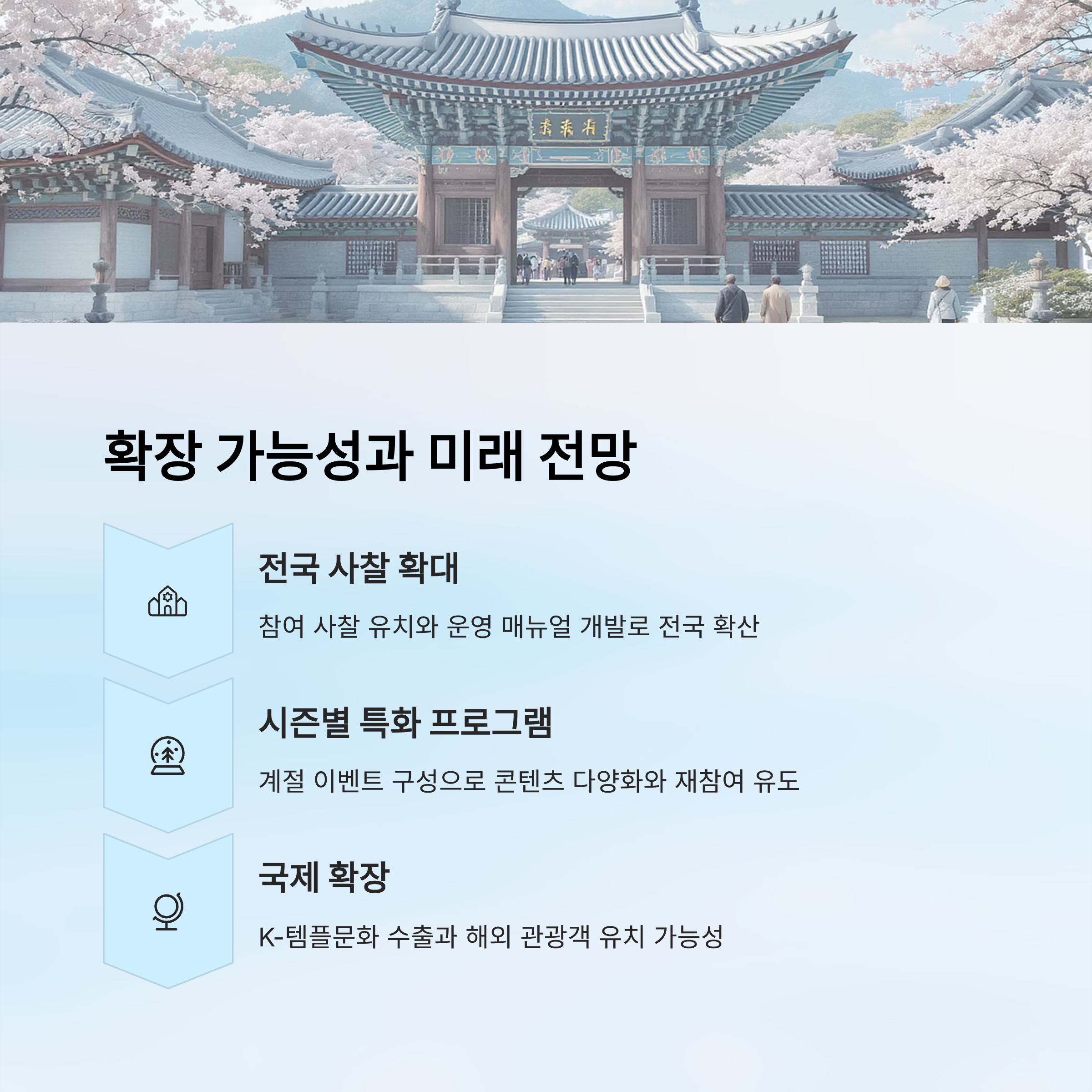 | 국제 확장 (한류 관광 연계) | 통역 서비스, 해외 홍보 | K-템플문화 수출, 관광객 유치 |