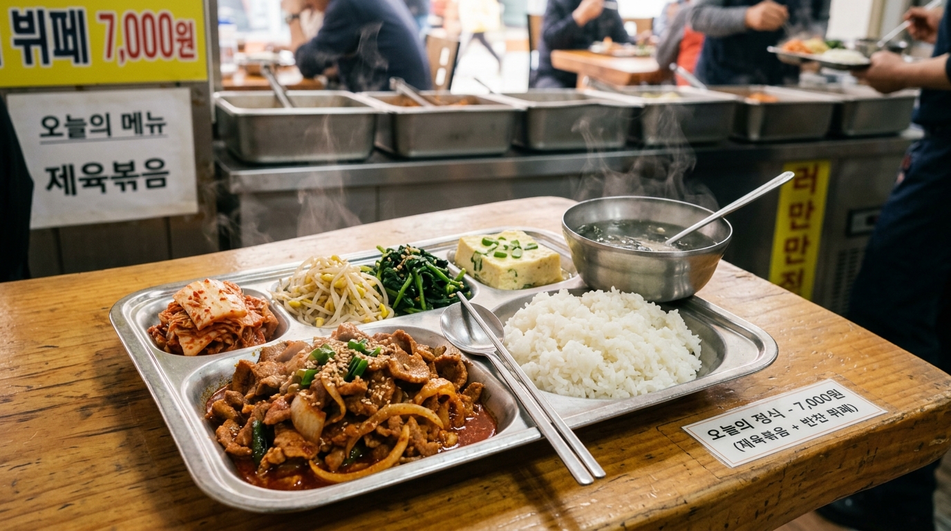 이곳의 저렴한 가격 비결은 '지하 상가'라는 입지 조건과 '셀프 서비스'에 있었습니다. 주인장께 여쭤보니 "박리다매가 아니면 살아남을 수 없다"고 하시더군요. 하지만 맛은 결코 저렴하지 않았습니다. 특히 매일 바뀌는 메인 메뉴(제육볶음, 돈가스 등)는 인근 직장인들이 줄을 서서 먹는 이유를 증명해 주었습니다. 제 경험상 11시 30분 전에 가셔야 여유롭게 식사가 가능합니다.