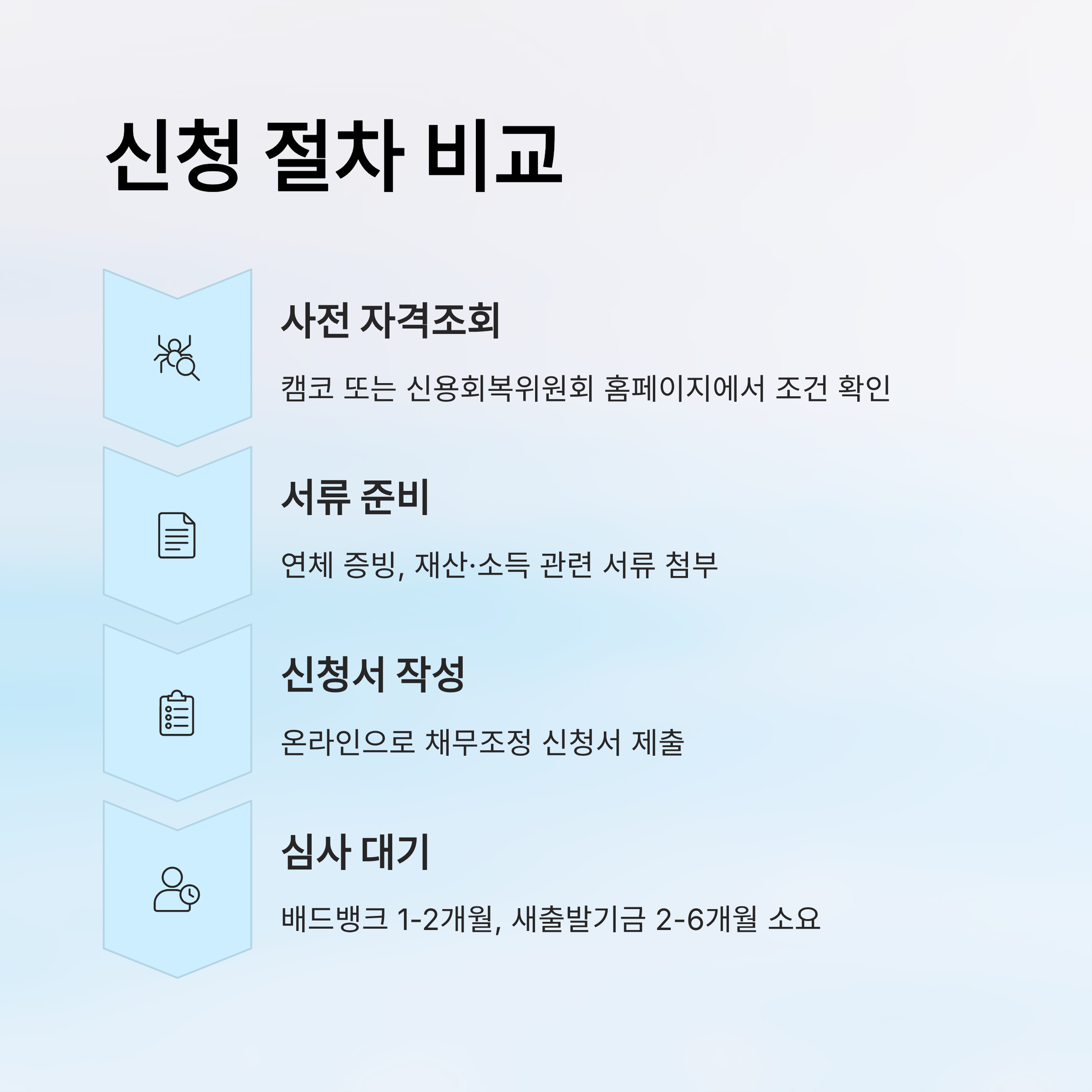 두 제도 모두 채무자를 지원하지만, 지원받을 수 있는 대상 요건이 확실히 달라요. 자신이 어떤 조건에 해당하는지 파악하는 게 가장 먼저 해야 할 일이에요. 🤓