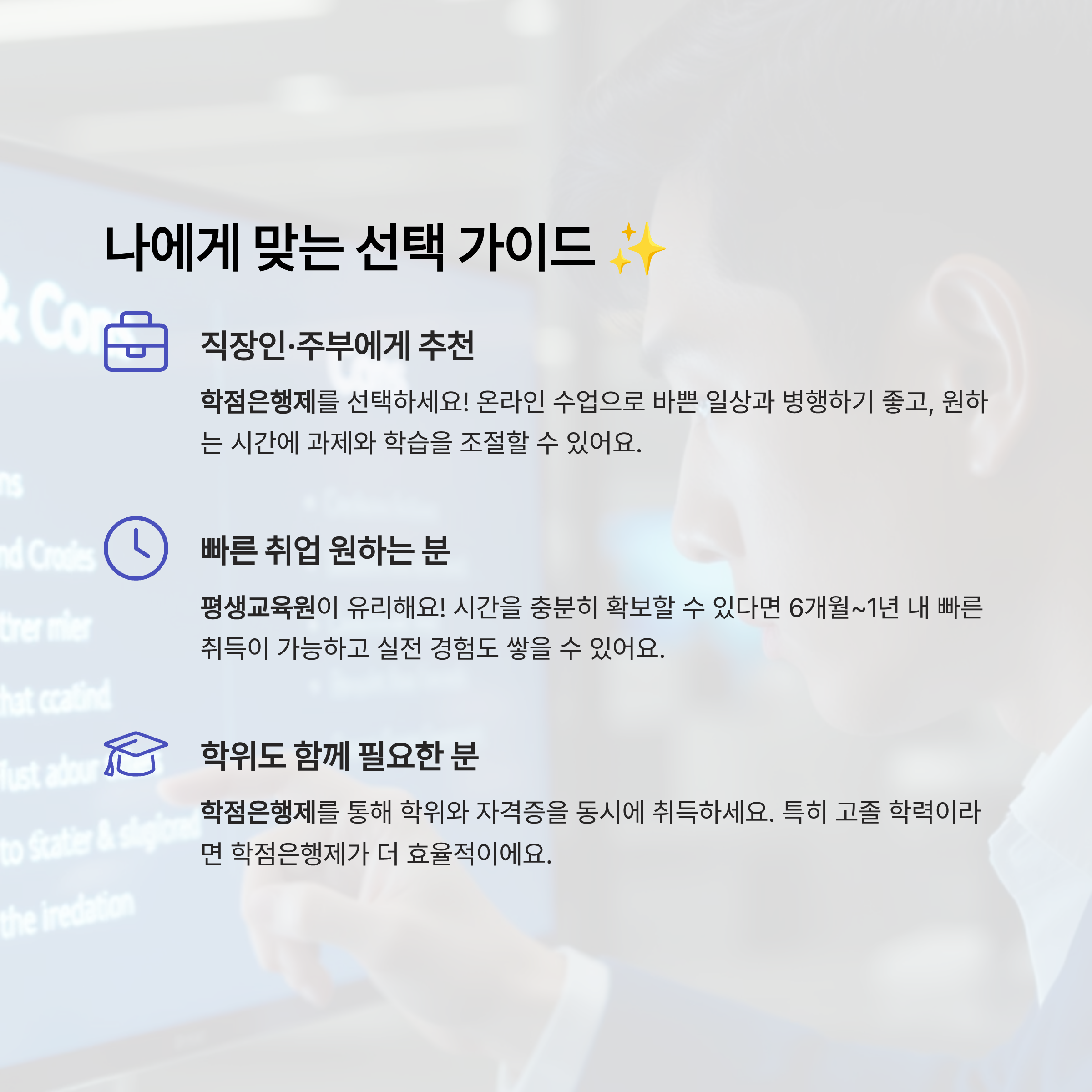 👉 직장인, 주부, 시간 분배가 필요한 사람이라면 학점은행제가 훨씬 유리해요. 온라인으로 수업을 들을 수 있고, 내가 원하는 시간에 과제와 학습을 조절할 수 있기 때문에 바쁜 일상과 병행하기 좋아요.