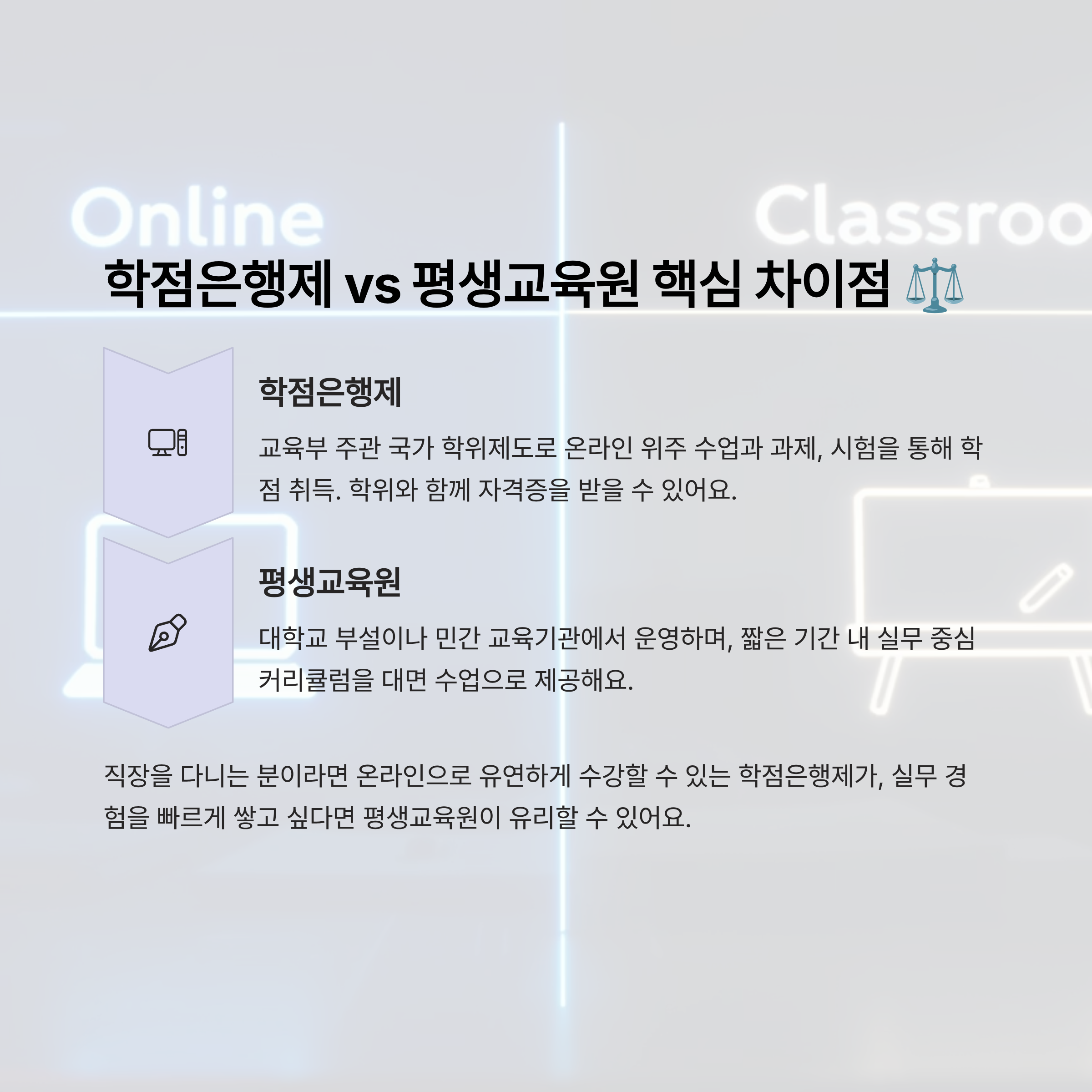 예를 들어, 학점은행제는 다양한 온라인 학습이 가능하고 시간 조율이 유연한 반면, 평생교육원은 실습 중심으로 운영되며 대면 수업이 많고 기관별로 편차도 심하답니다.