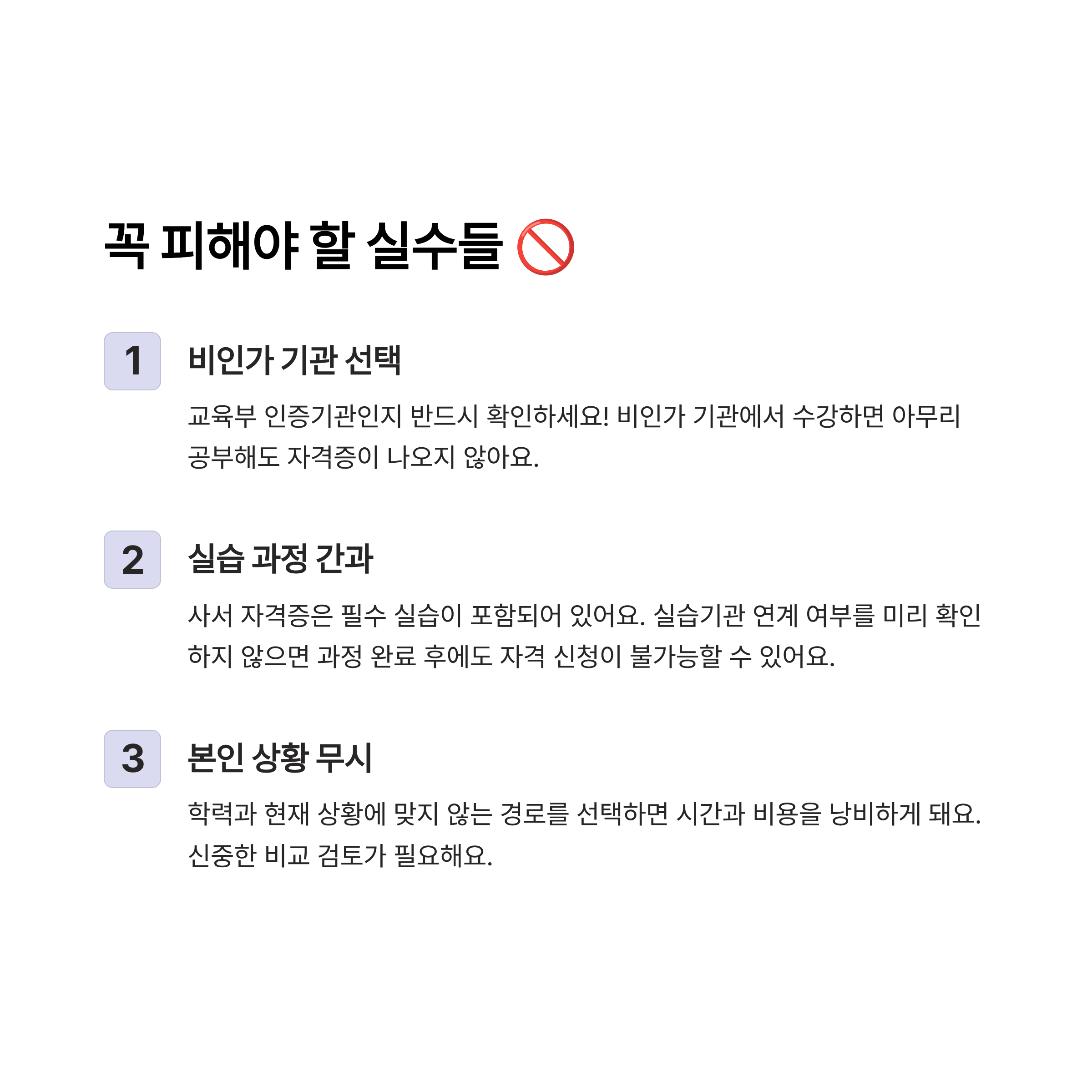 사서자격증을 준비하면서 많은 분들이 실수하는 부분들이 있어요. 이 실수만 피하더라도 더 빠르고 효율적인 준비가 가능하답니다.