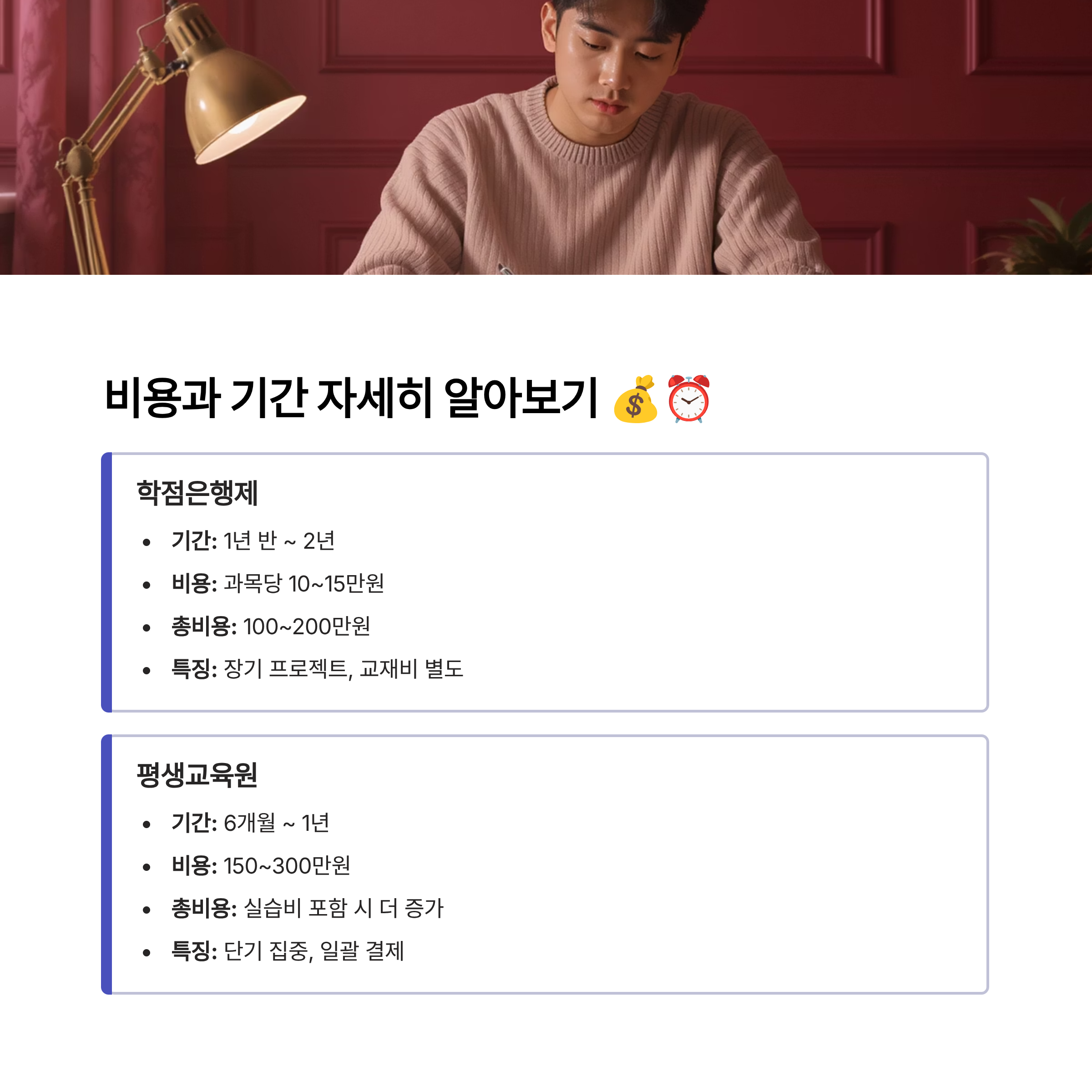 반면, 평생교육원은 기간이 훨씬 짧아요. 빠르면 6개월, 늦어도 1년 이내에 마무리할 수 있는 과정들이 많죠. 그러나 비용은 상대적으로 더 들 수 있어요. 보통 150만 원에서 300만 원 사이이며, 실습비 포함 시 더 올라가기도 해요.