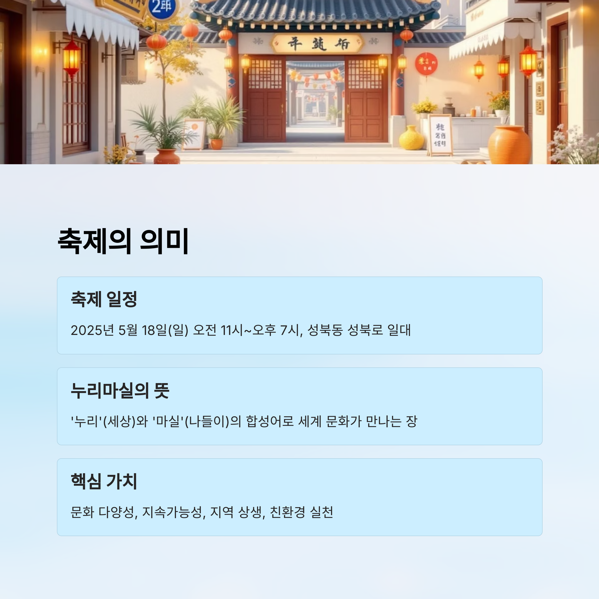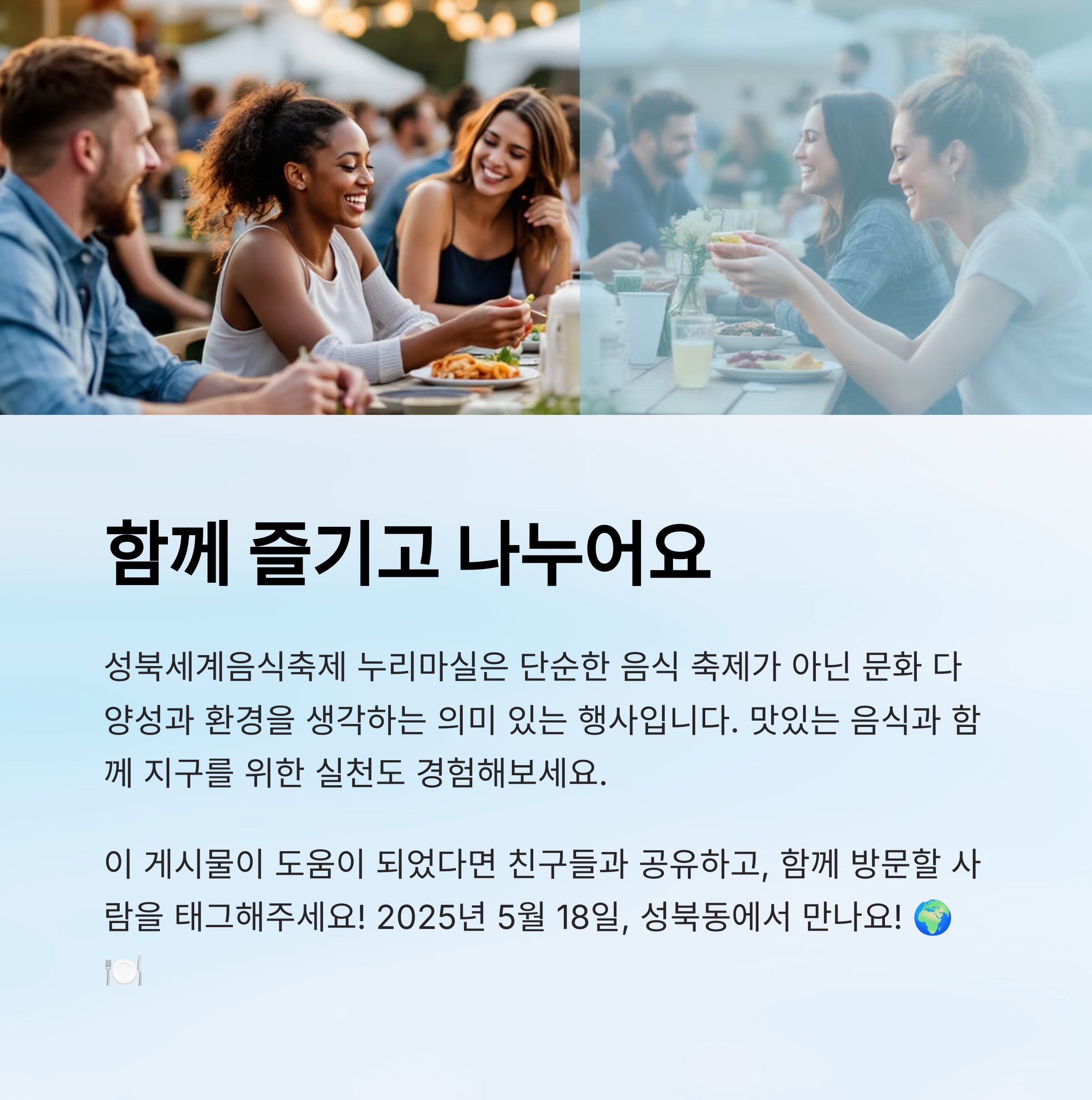 🌍 매년 6만 명이 넘는 사람들이 모이는 성북세계음식축제 누리마실! 이제 2025년 5월 18일에 다시 찾아온다고 해요. 이번에는 17번째로 열리는 만큼 더욱 풍성하고 다채로운 프로그램들이 준비되어 있답니다.