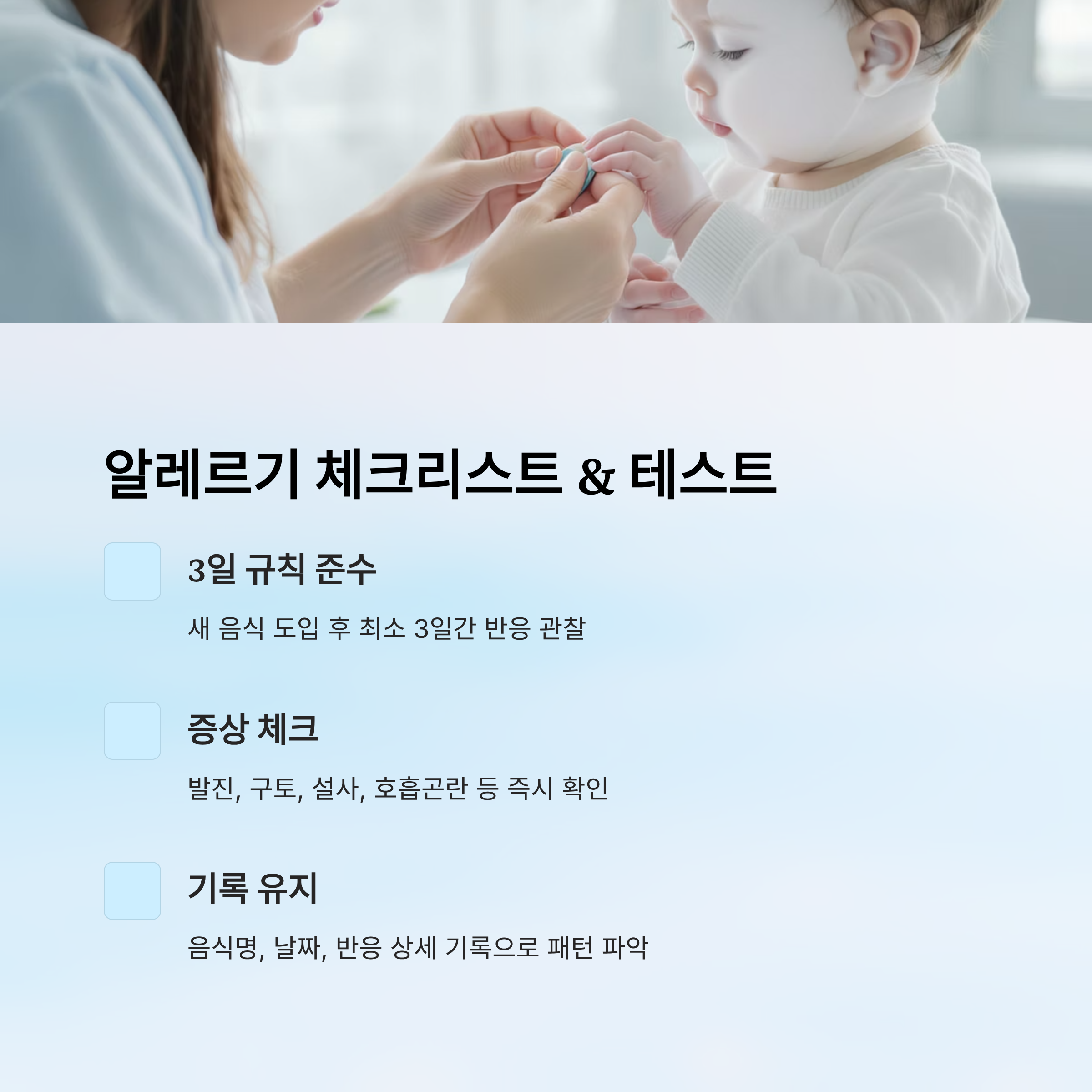 단계별 이유식은 정답이 정해져 있는 게 아니라 가이드라인일 뿐이에요. 아기가 잘 받아들이면 빠르게 진행할 수도 있고, 거부감이 크면 속도를 늦춰도 괜찮아요. 중요한 것은 아기가 즐겁고 안전하게 새로운 음식을 경험하는 것이에요. 다음 섹션에서는 알레르기 체크리스트와 테스트 방법을 자세히 알아볼게요. ✅