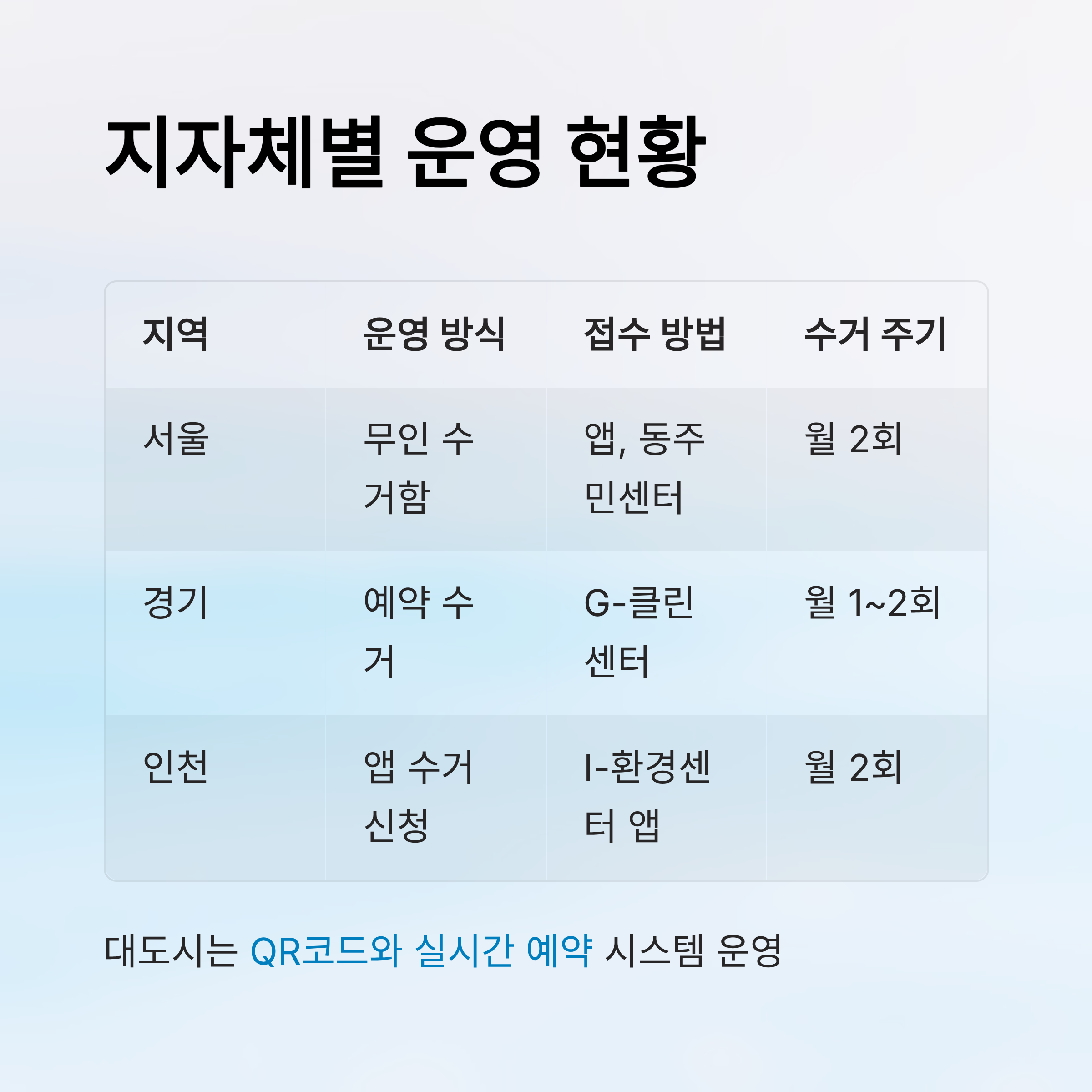 | 지역 | 운영 방식 | 접수 방법 | 수거 주기 |
