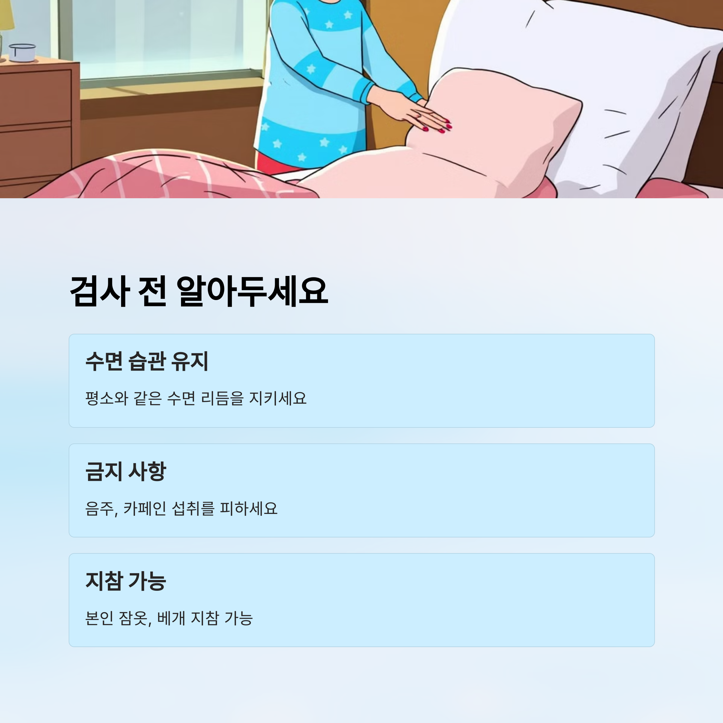 검사를 미루지 말고, 오늘이라도 예약해보는 건 어떨까요? 💤