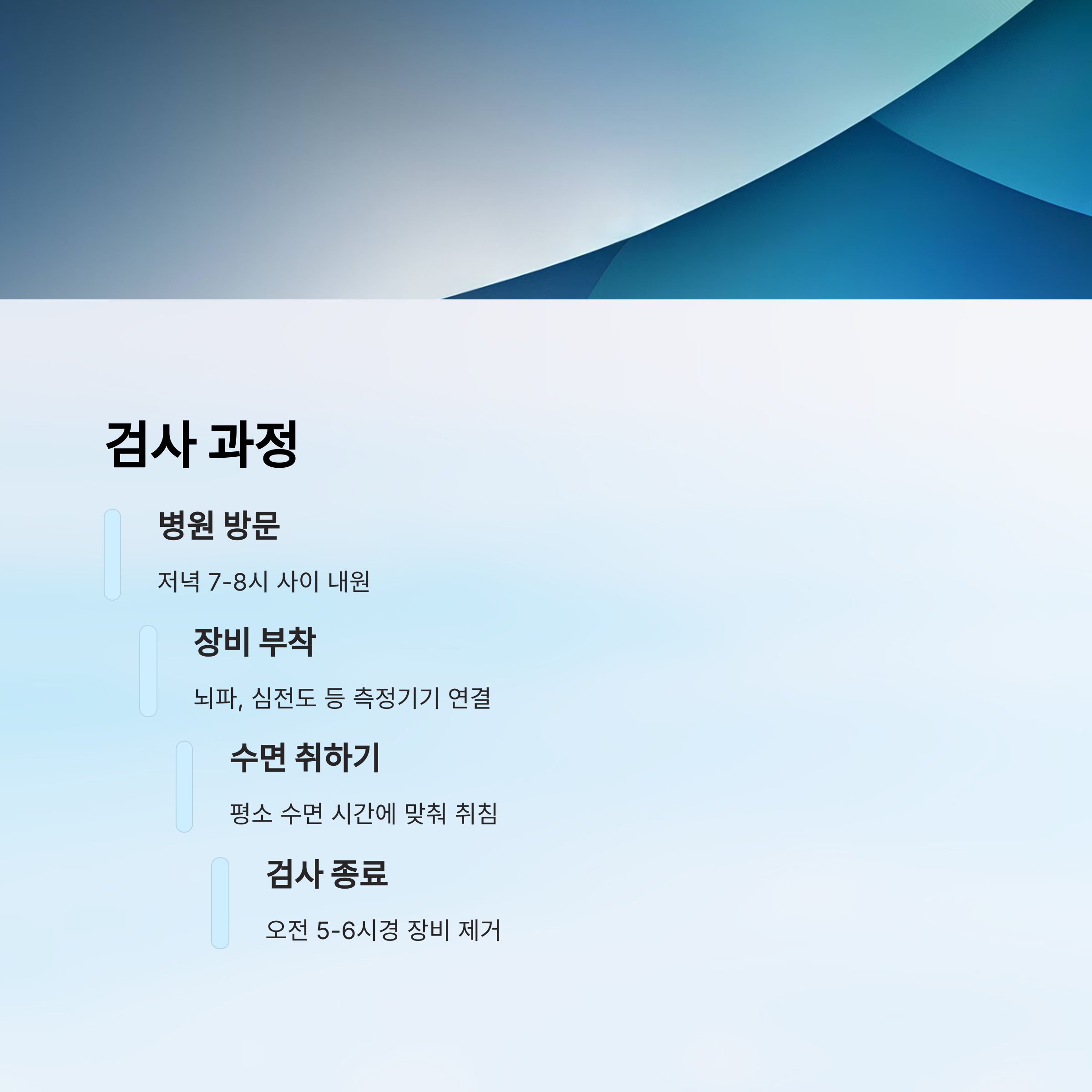검사 시작 전에는 설문지 작성과 기초 상담이 이루어지고, 복용 중인 약이 있다면 미리 알려주는 게 꼭 필요해요. 일부 약은 뇌파나 수면 구조에 영향을 미칠 수 있답니다.