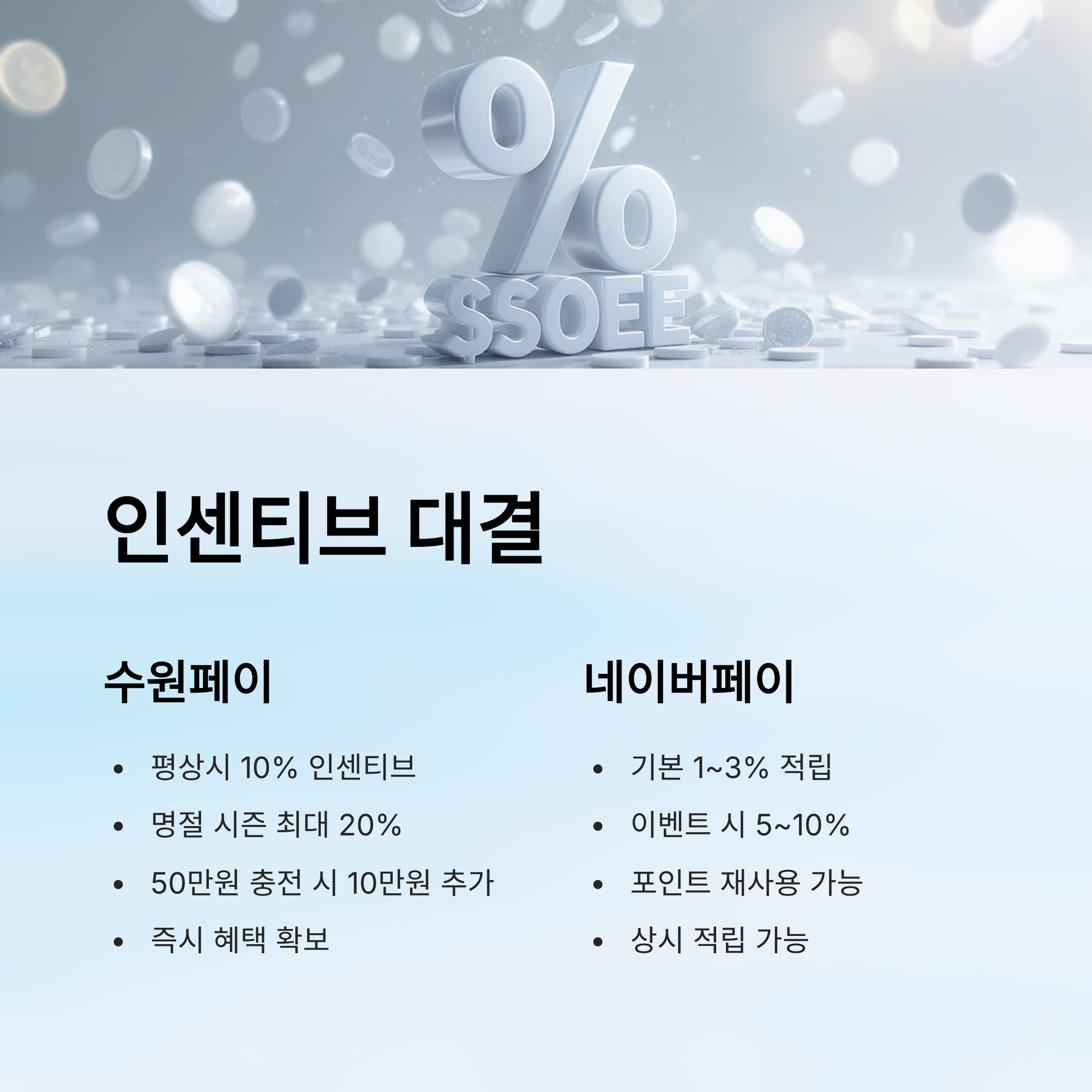 요약하자면, 수원페이는 빠른 시점에서 높은 인센티브를 확보할 수 있는 구조고, 네이버페이는 꾸준한 적립과 범용성을 바탕으로 장기적인 이익을 누릴 수 있어요. 어느 쪽이 더 좋다기보다는, 본인 소비패턴에 따라 최적의 선택이 달라져요!