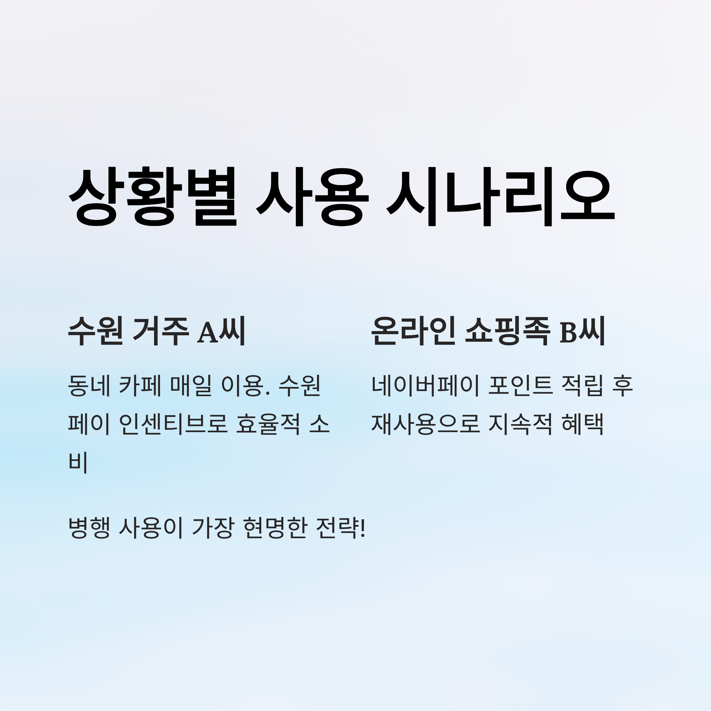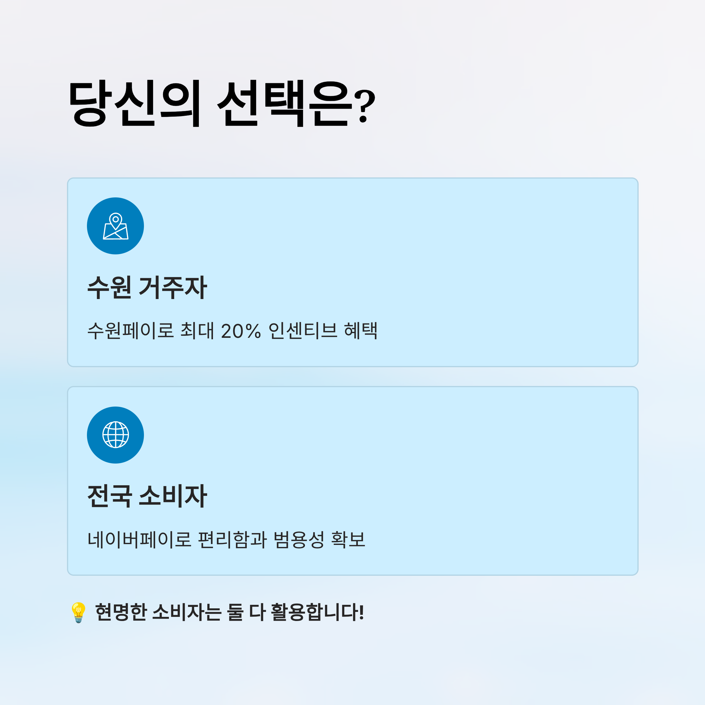 이처럼 ‘지역 밀착형 실사용자’는 수원페이, ‘전국 단위 소비자’는 네이버페이가 유리하다고 볼 수 있어요. 복수로 병행 사용하는 것도 현명한 소비 전략이에요!