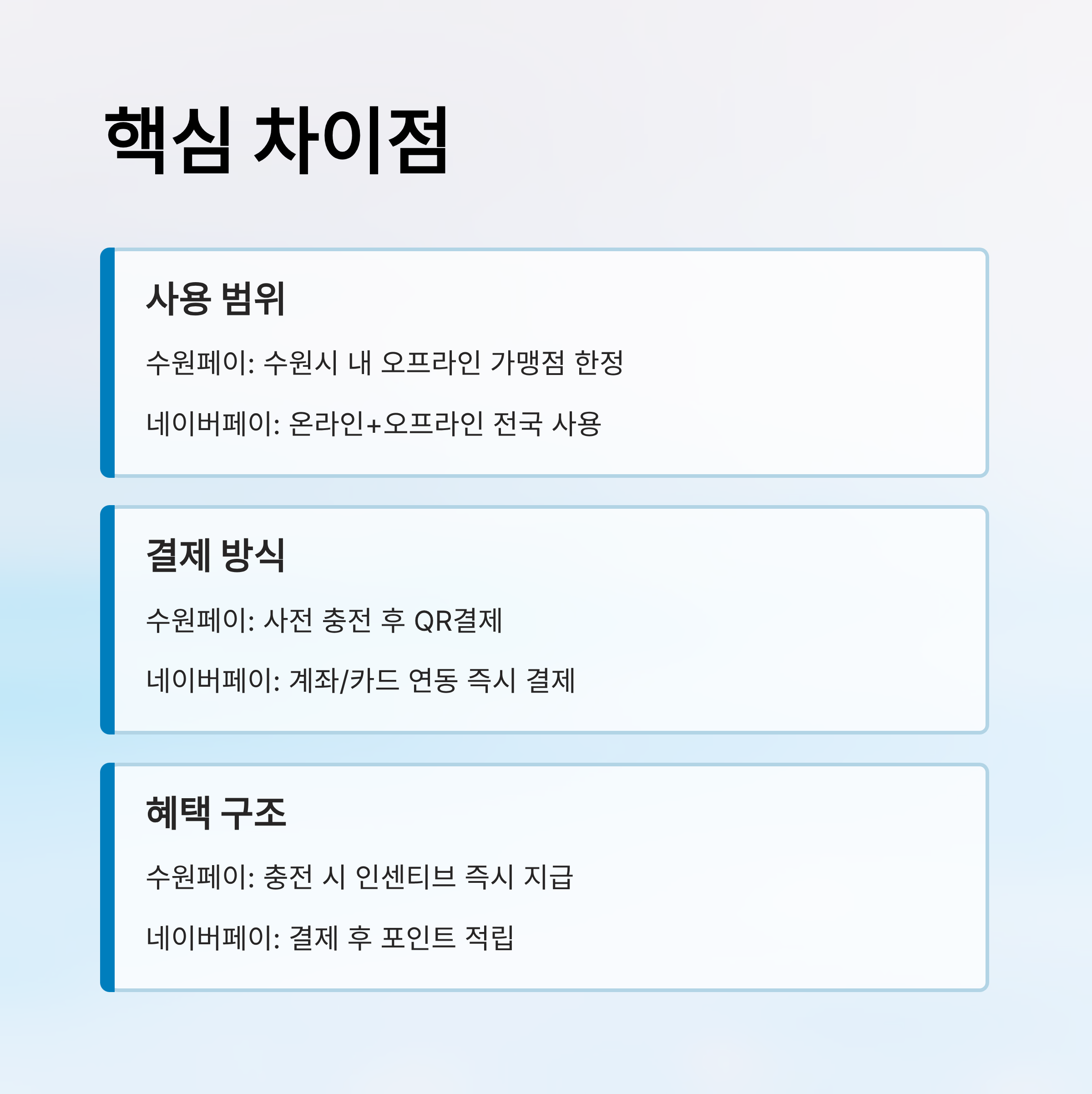 | 구분 | 수원페이 | 네이버페이 |