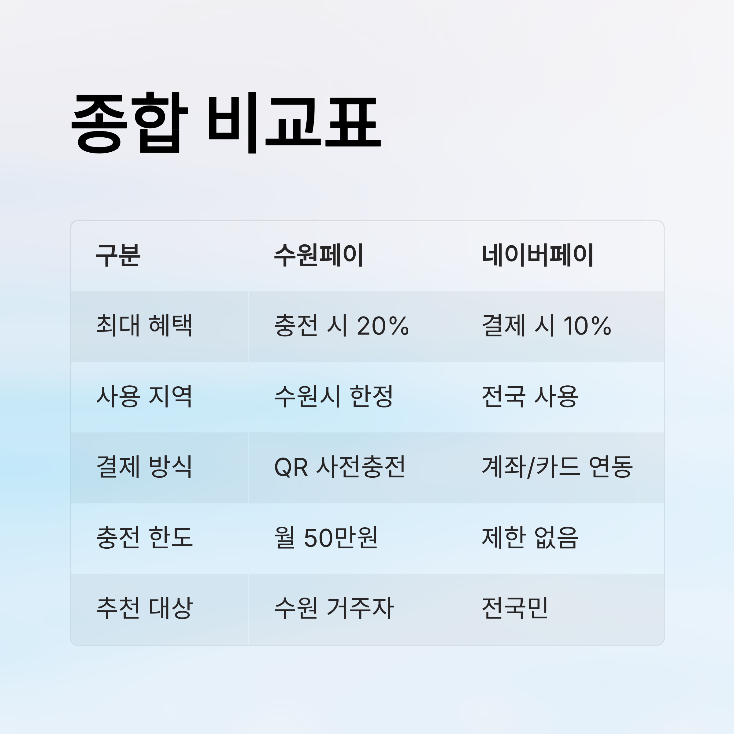 두 서비스를 간단히 정리하자면, 수원페이는 ‘지역밀착형 소비혜택’, 네이버페이는 ‘편리함과 접근성’이 강점이에요. 사용자 목적에 따라 선택이 갈리는 지점이죠.