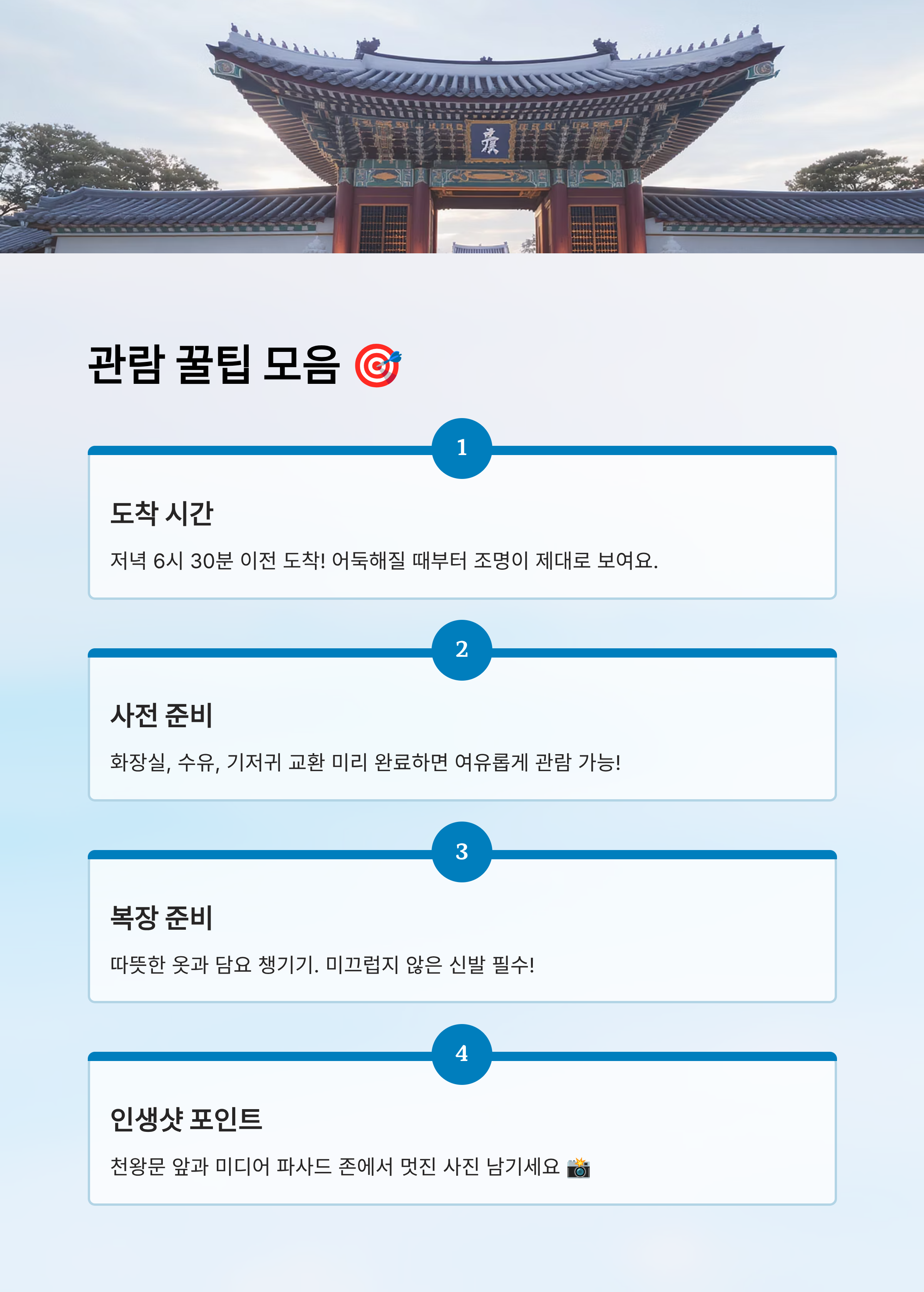 추운 날씨를 대비해서 따뜻한 옷, 담요를 챙기는 것도 중요하고, 아이의 신발은 미끄럽지 않은 걸로 준비하면 좋아요. 성보박물관 근처에는 바닥이 약간 미끄럽기 때문에 안전이 우선이에요. 또, 사진 찍기 좋은 구간은 천왕문 앞과 미디어 파사드 존이니 인생샷도 놓치지 마세요 📸