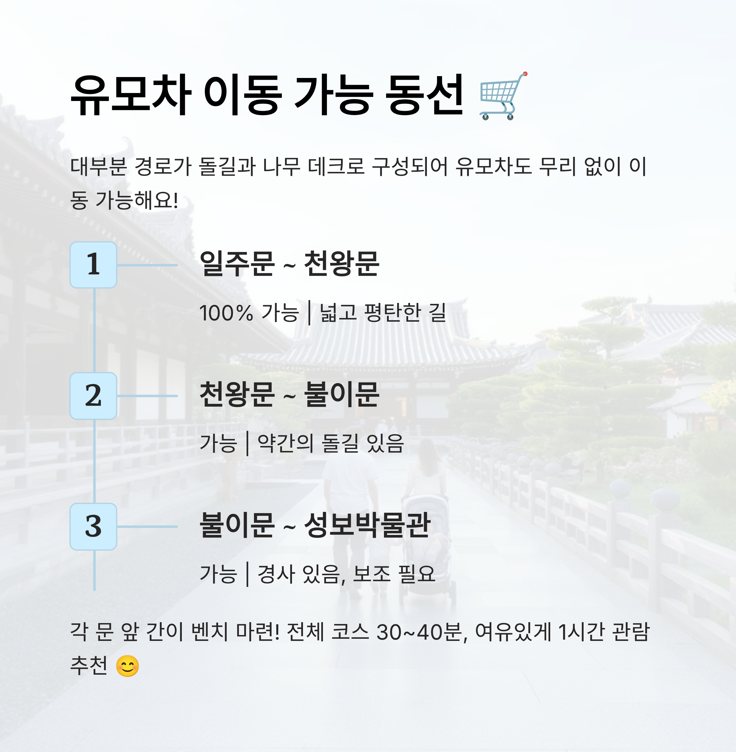 불이문에서 성보박물관으로 올라가는 구간은 약간의 경사가 있지만 유모차 이용에 불편함이 크지는 않아요. 다만 메인 공연 시간 직전에는 관람객이 몰릴 수 있으니 이 구간에서는 잠깐 대기하거나 시간을 조절해 이동하는 게 좋아요. 성보박물관 내부로 들어가는 입구는 자동문이며, 실내 전시장도 유모차 진입이 가능해요.