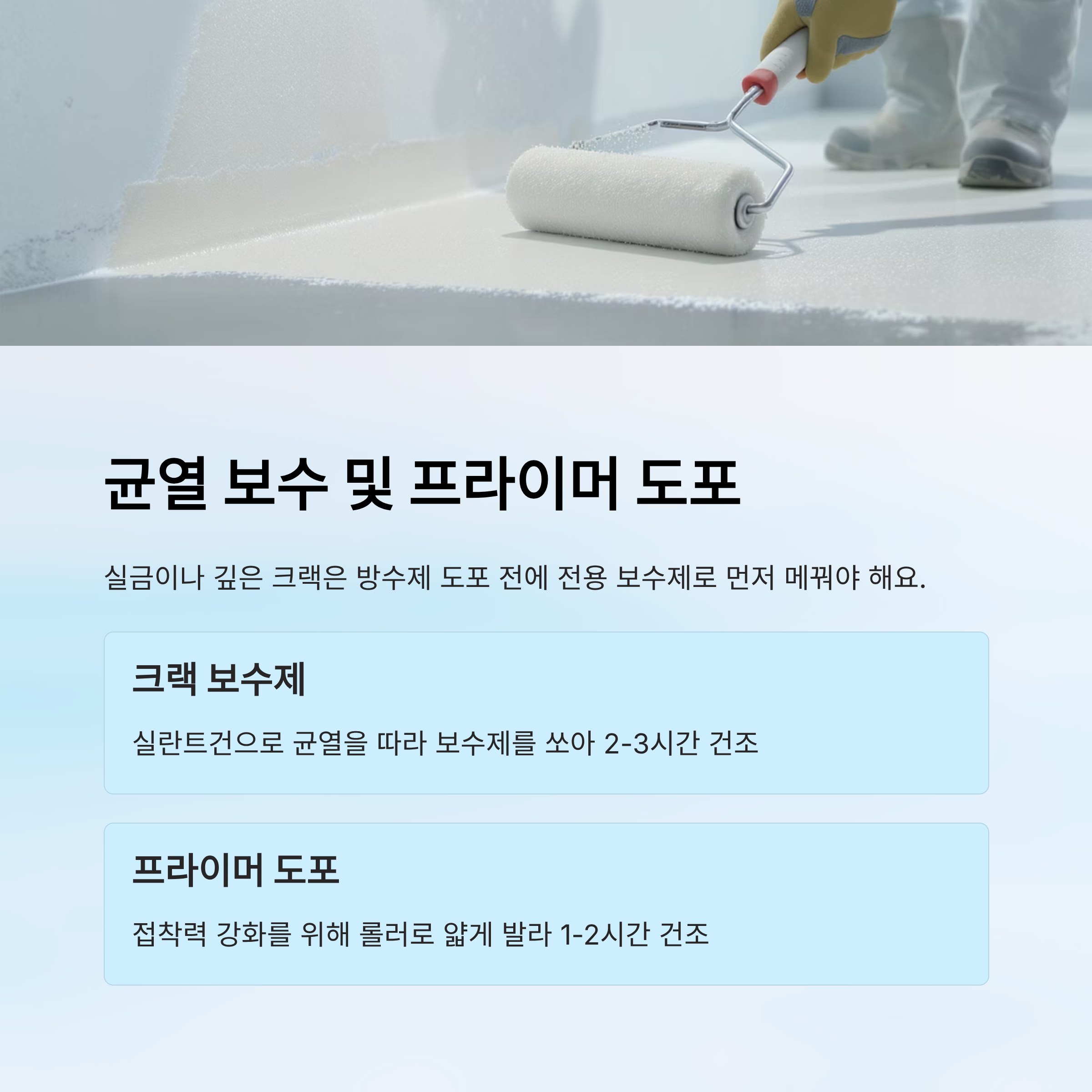 균열과 프라이머 작업은 전체 방수 품질을 좌우하는 핵심 단계예요. 대충 넘어가면 방수층 수명이 짧아지니 신중하게 해주세요!