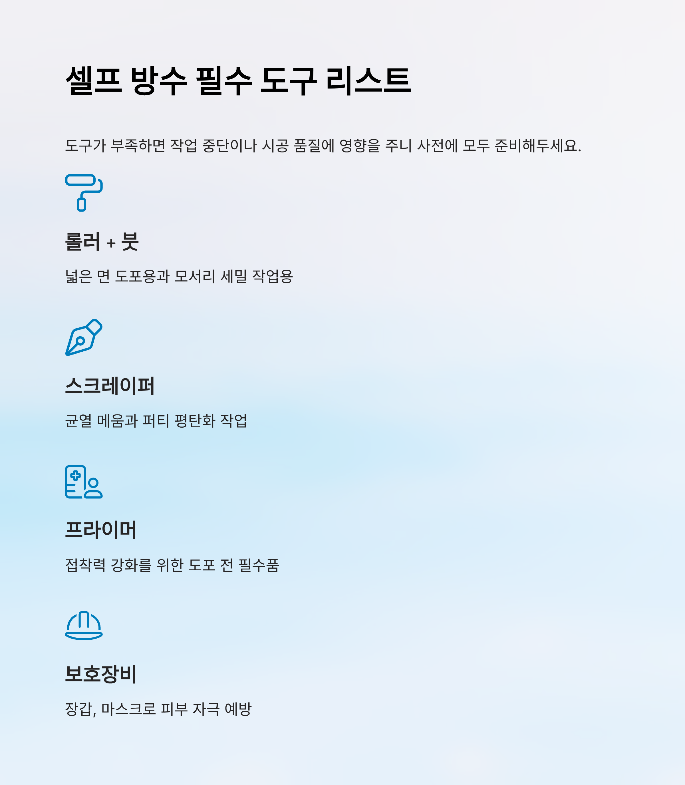 셀프 방수를 할 때는 몇 가지 기본 장비가 필요해요. 도구가 부족하면 작업 중단이 생기거나, 시공 품질에 영향을 주기 때문에 사전에 모두 준비해두는 게 좋아요.