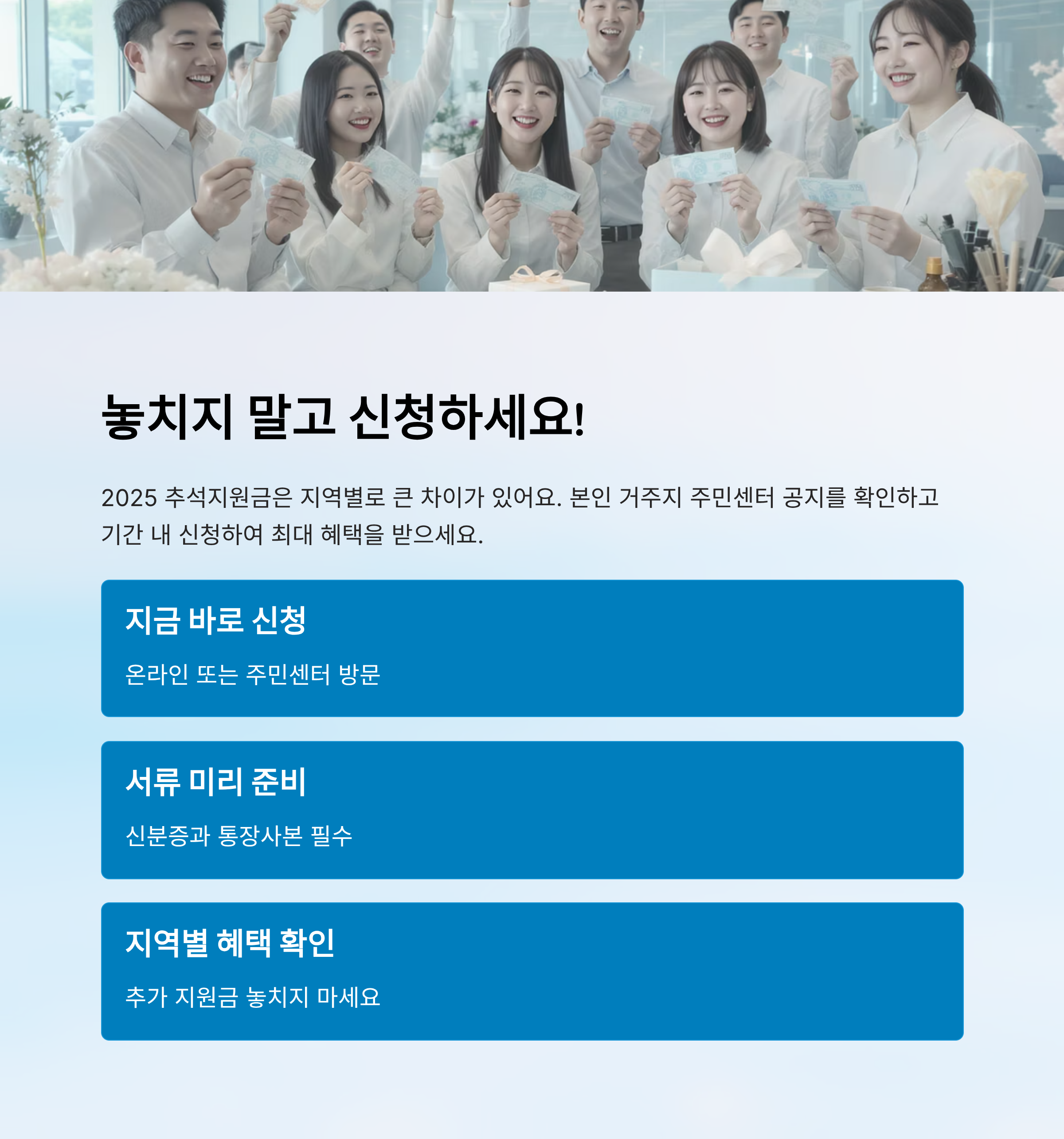 정리하면, 지자체별 지원금은 금액도 다양하고 지급 방식도 다 달라요. 같은 추석지원금이라도 어디에 사느냐에 따라 체감 차이가 크기 때문에, 거주지별로 꼭 확인하고 챙겨야 해요. 👍