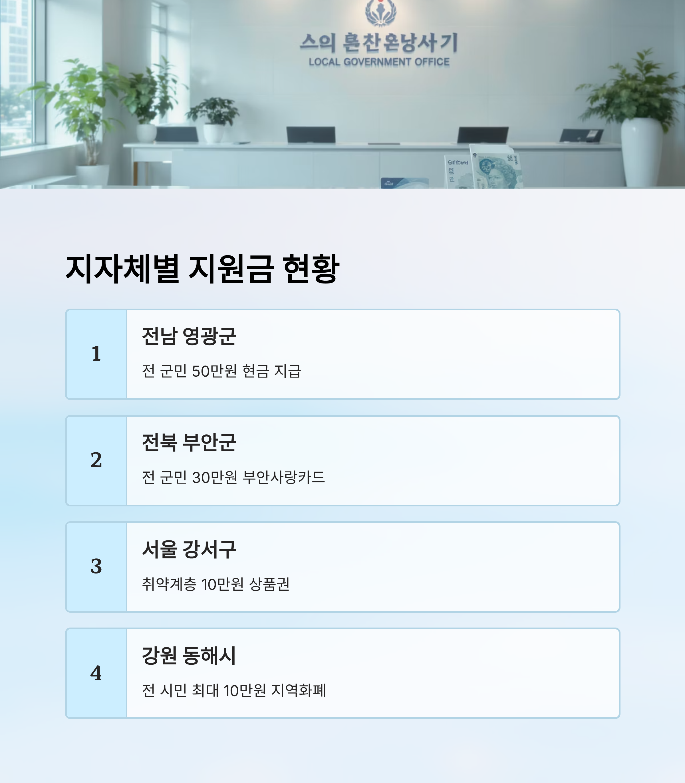 전북 부안군은 30만 원을 전 군민에게 지급하고 있어요. 여기에 정부 지원금을 합치면 최대 55만 원 이상이 돼요. 서울 강서구는 취약계층을 중심으로 10만 원을 지급하는데, 정부 지원금까지 더하면 약 35만 원을 받을 수 있답니다. 🏙️
