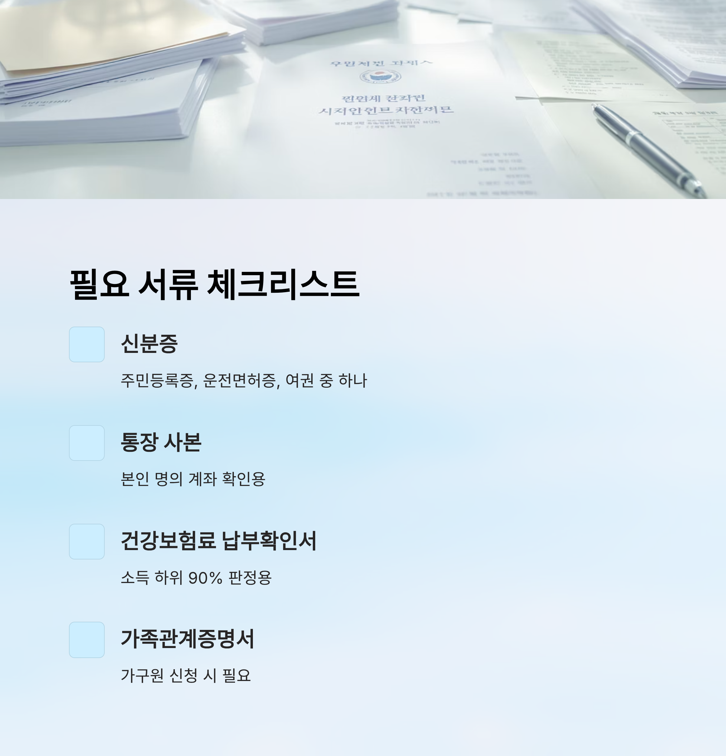 두 번째로 많이 요구되는 서류는 통장 사본이에요. 현금이나 계좌 입금 형태로 지원금을 받을 때는 본인 명의의 통장 사본을 제출해야 해요. 만약 가족 명의 계좌로 받고 싶다면 위임장과 가족관계증명서를 함께 제출해야 해요. 이런 부분은 지자체마다 조금씩 달라요. 🏦