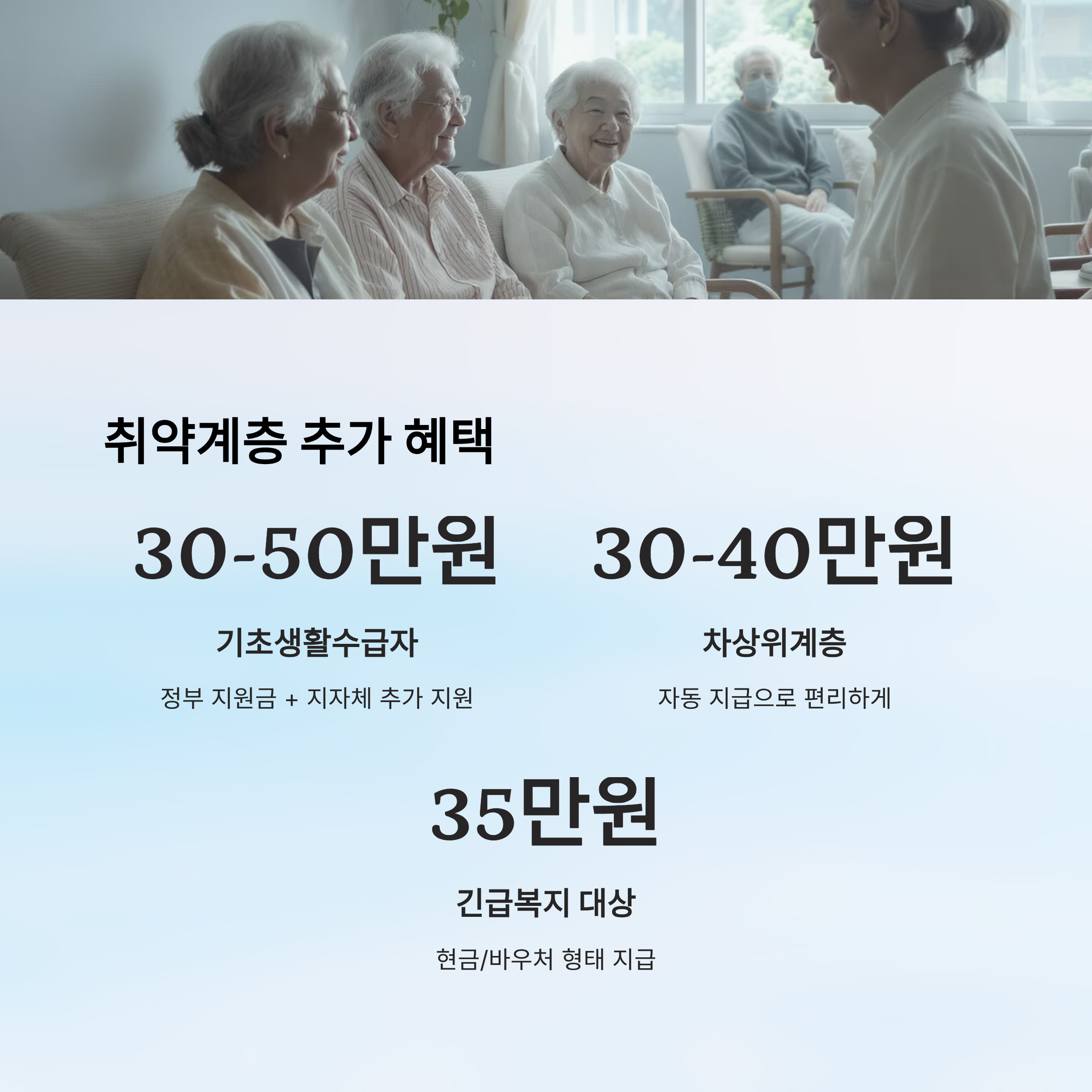 이번 정책의 특징 중 하나는 ‘취약계층 배려’예요. 기초생활수급자, 차상위계층, 긴급복지 대상자 등은 별도의 신청 없이 자동으로 지급되는 경우가 많아 번거로움이 없어요. 정부는 이들을 위해 평균 30만 원에서 40만 원까지 더 높은 금액을 지급해 실질적 생활 안정 효과를 높이고 있어요. 🍀