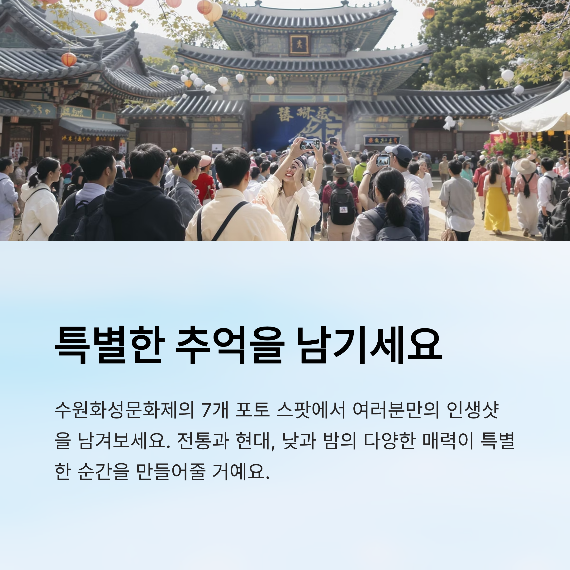 특히 MZ세대 사이에서 ‘인생샷 명소’는 축제를 즐기는 또 다른 방식으로 자리 잡았어요. 제가 생각했을 때 수원화성문화제는 단순한 역사 축제가 아니라 SNS에서 빛나는 추억을 남길 수 있는 가장 트렌디한 무대예요. 낮과 밤, 전통과 현대가 어우러진 풍경은 그 자체로 완벽한 배경이 된답니다.