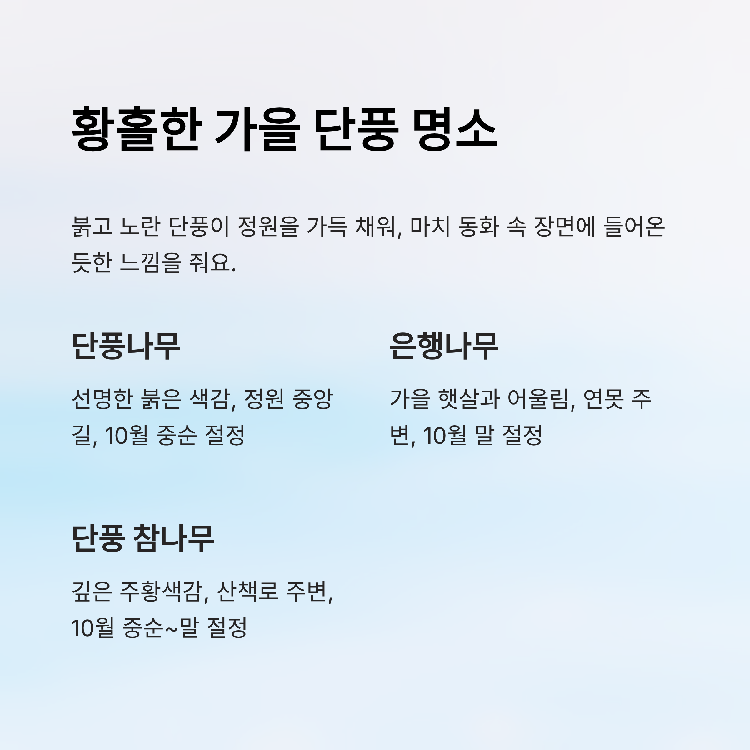 | 단풍나무 | 붉은색 | 선명한 붉은 색감 | 정원 중앙길 | 10월 중순 |