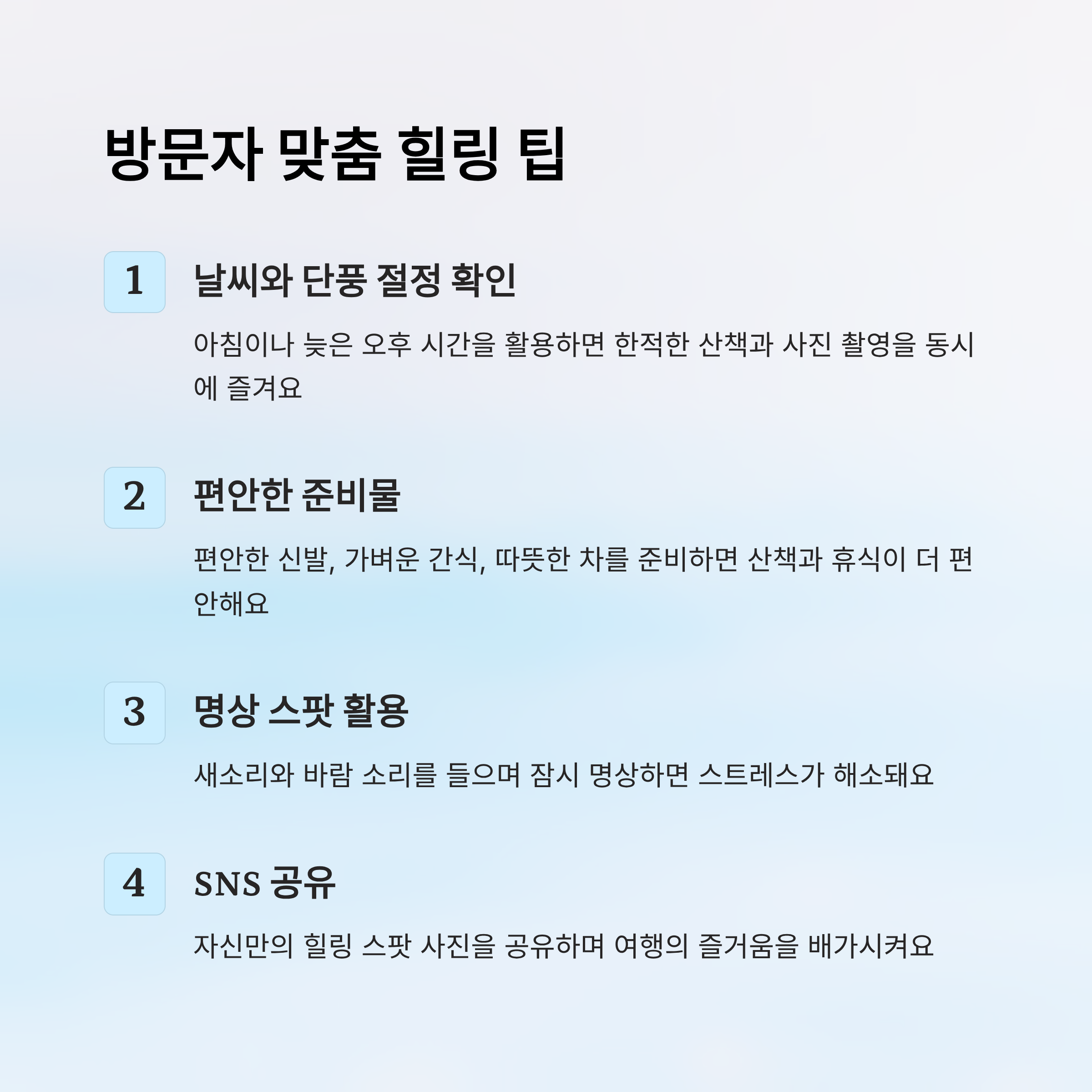 편안한 신발을 신고 가벼운 간식을 준비하면 산책과 휴식을 더 편안하게 즐길 수 있어요. 벤치나 쉼터에서 따뜻한 차와 함께 잠시 쉬는 것도 추천해요.