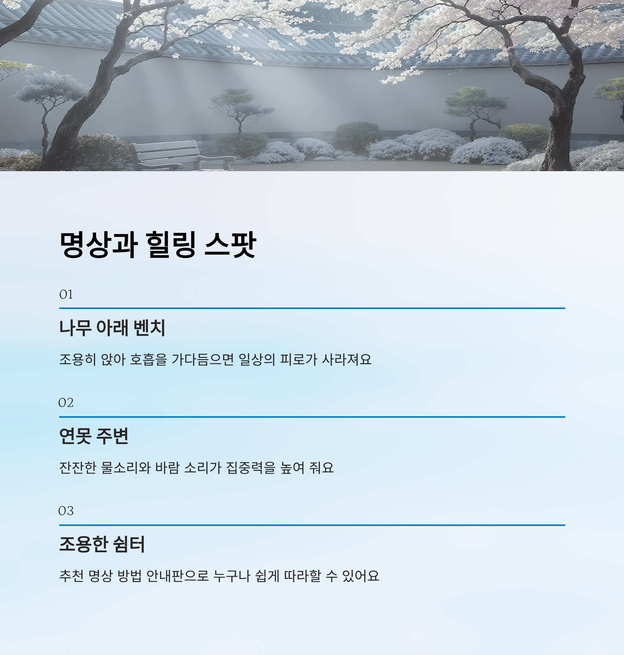 정원 내 조용한 쉼터에는 안내판과 함께 추천 명상 방법도 소개되어 있어, 누구나 쉽게 따라할 수 있어요. 명상 경험이 없어도 부담 없이 즐길 수 있답니다.