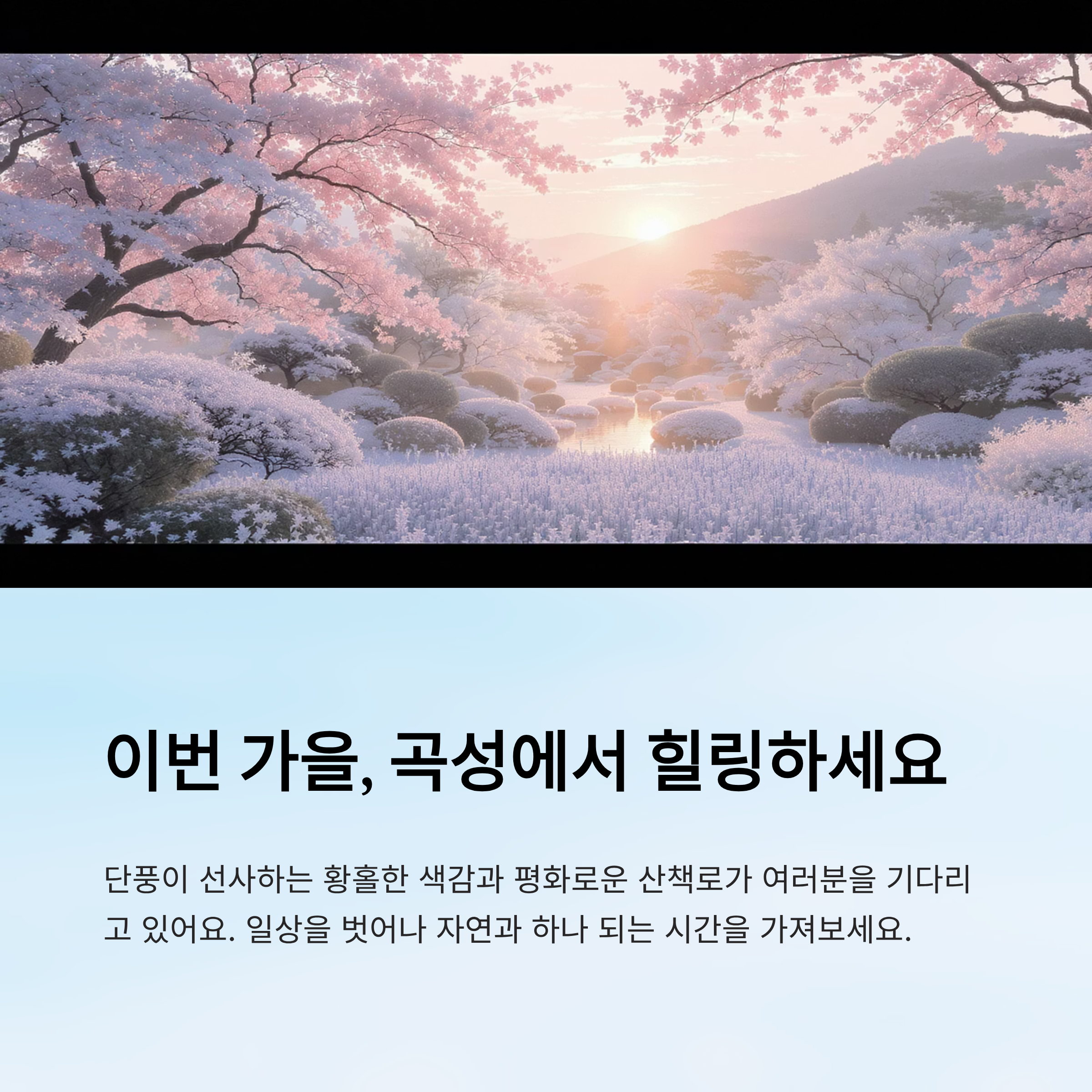 이번 가을, 곡성 동화정원에서 일상을 벗어나 자연과 하나 되는 시간을 가져보세요. 단풍이 선사하는 황홀한 색감과 평화로운 산책로가 여러분을 기다리고 있답니다.