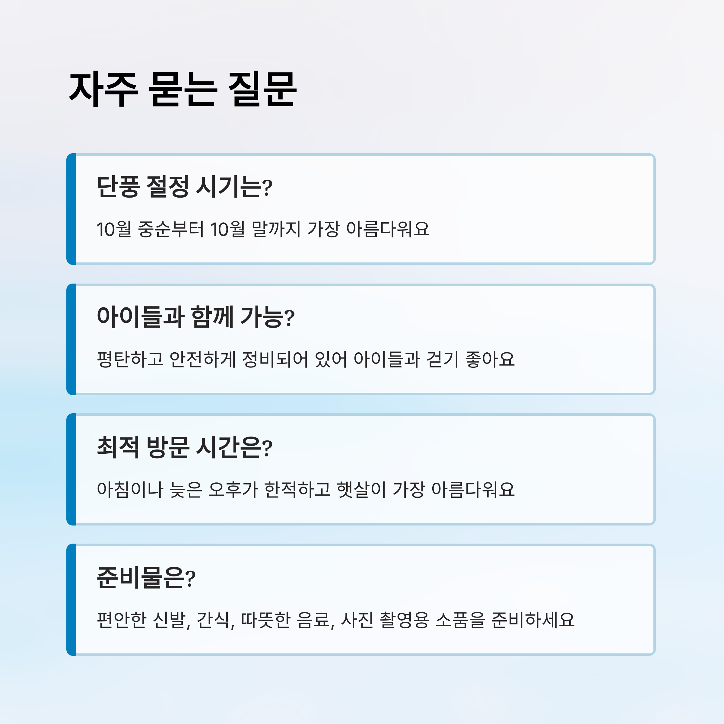 A1. 10월 중순부터 10월 말까지 단풍이 가장 아름다워요. 이 시기에 방문하면 붉은 단풍과 노란 은행잎을 동시에 즐길 수 있어요.