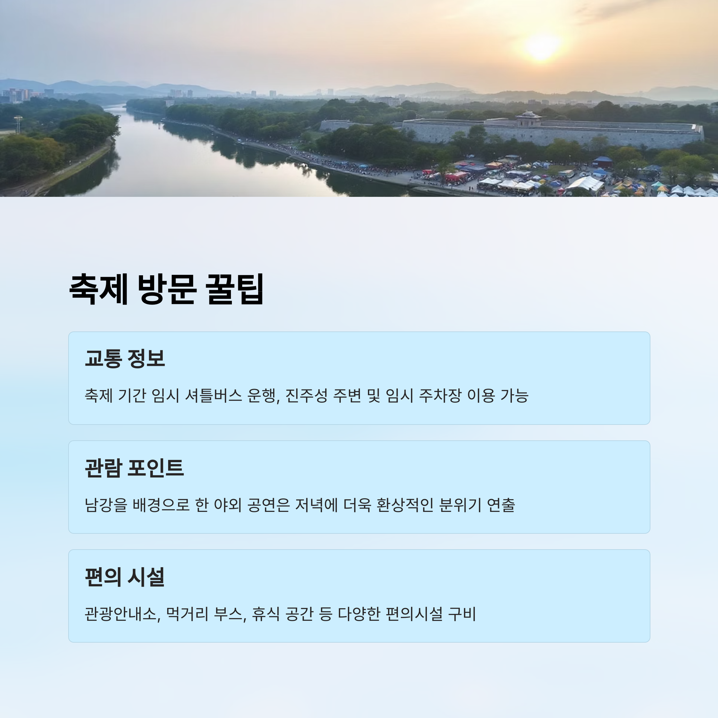 특히 남강을 배경으로 펼쳐지는 야외 공연들은 정말 환상적이에요. 밤이 되면 진주성의 조명과 남강의 물결이 어우러져 환상적인 분위기를 만들어낸답니다.🌟