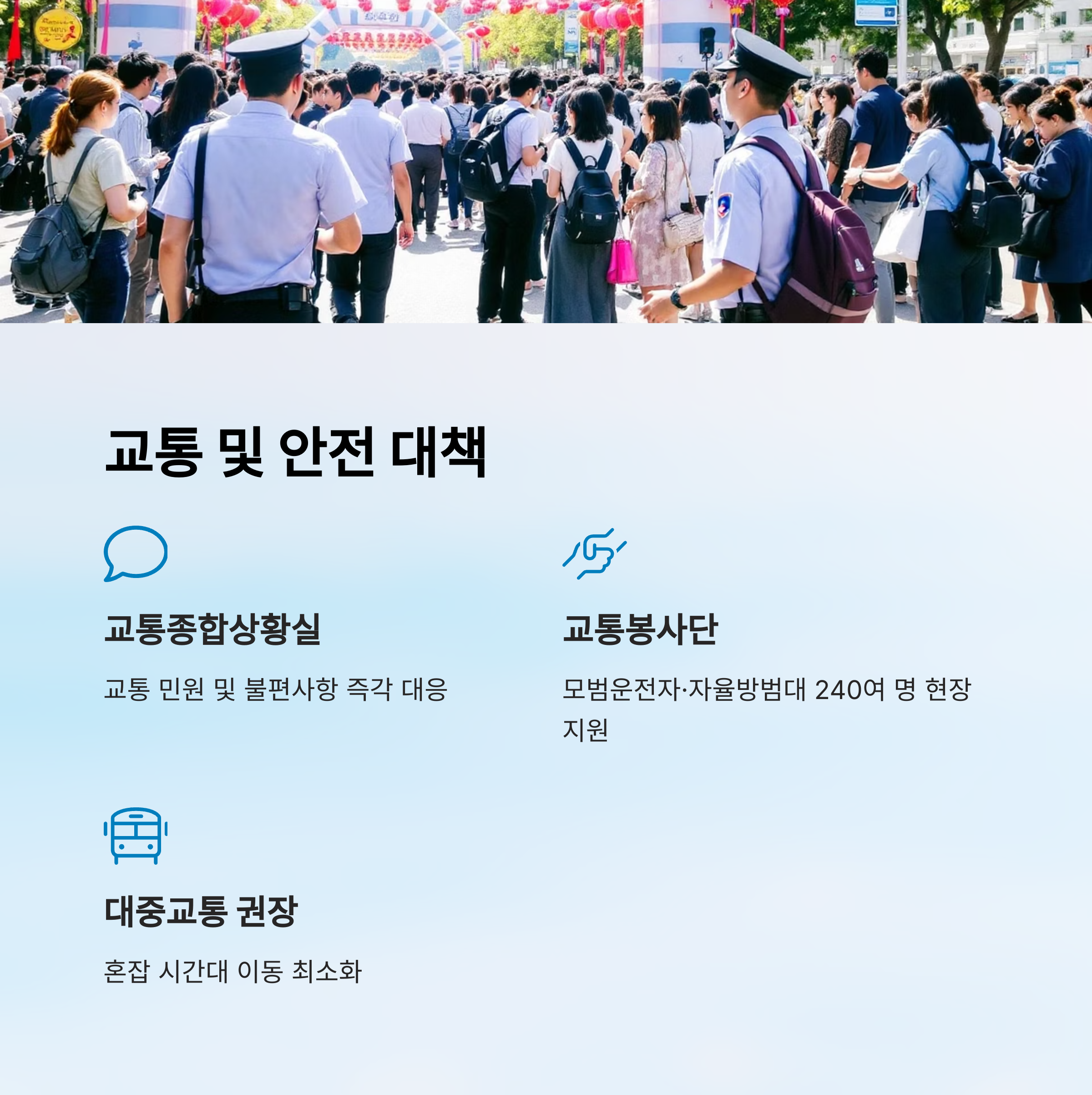 | 교통 봉사단체 배치 | 모범운전자·자율방범대 240여 명 현장 지원 |