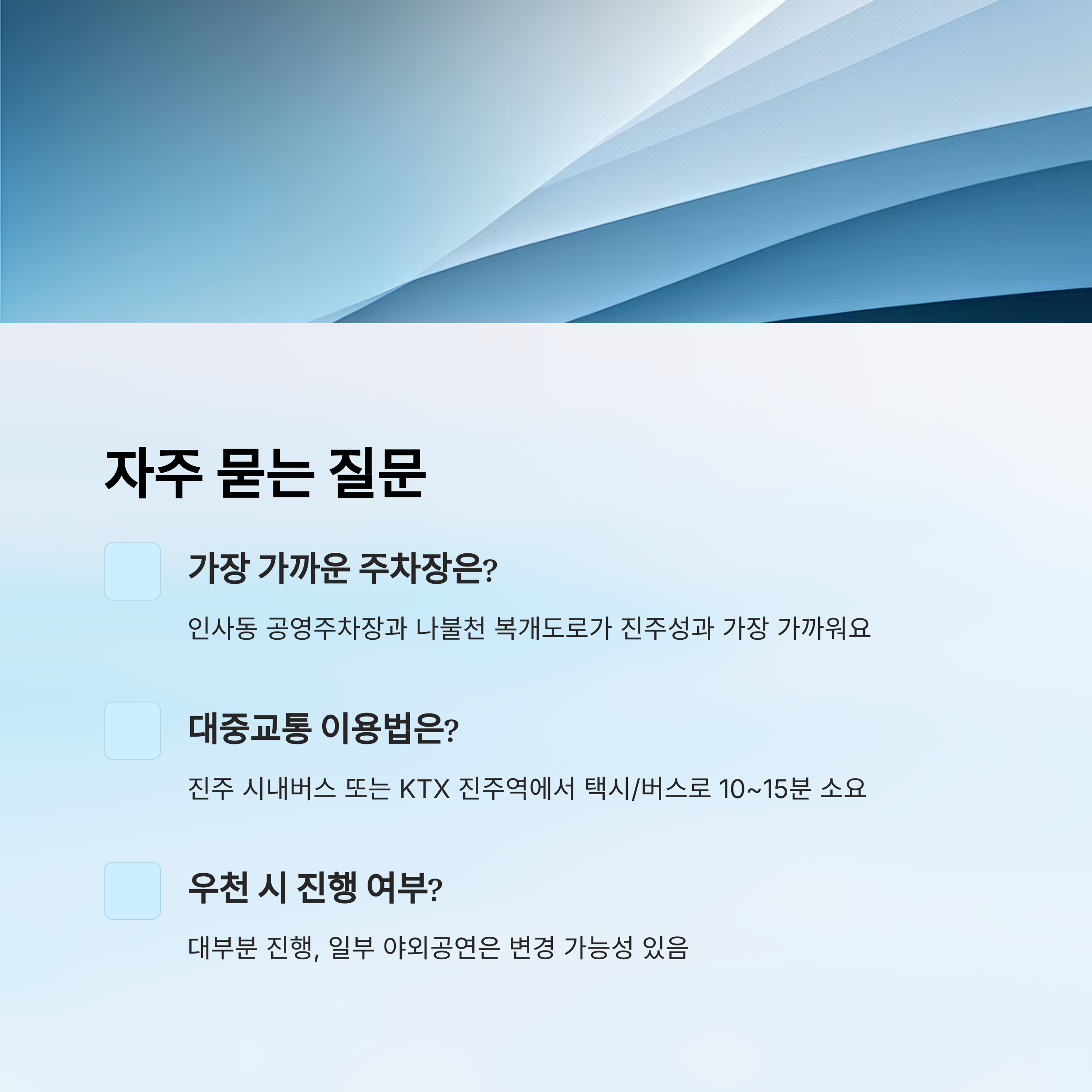 A3. 진주 시내버스를 이용하거나, KTX 진주역에서 택시 또는 시내버스로 10~15분 정도 이동하면 돼요.
