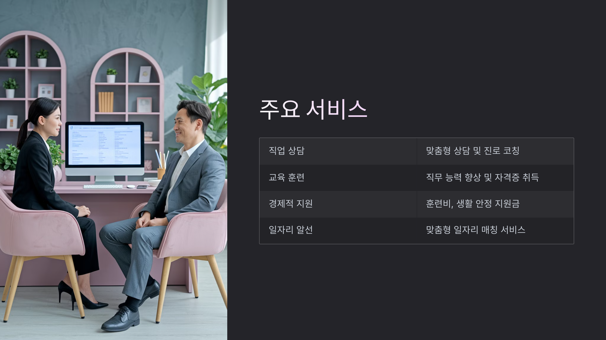 | 4. 취업 지원 및 일자리 매칭 | 맞춤형 일자리 알선 및 기업 연결 |