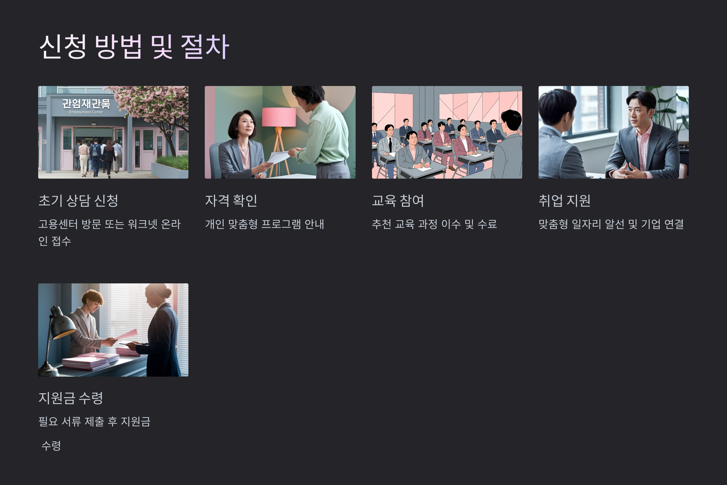 | 2. 자격 확인 및 프로그램 추천 | 직업 상담을 통해 개인 맞춤형 프로그램 안내 |