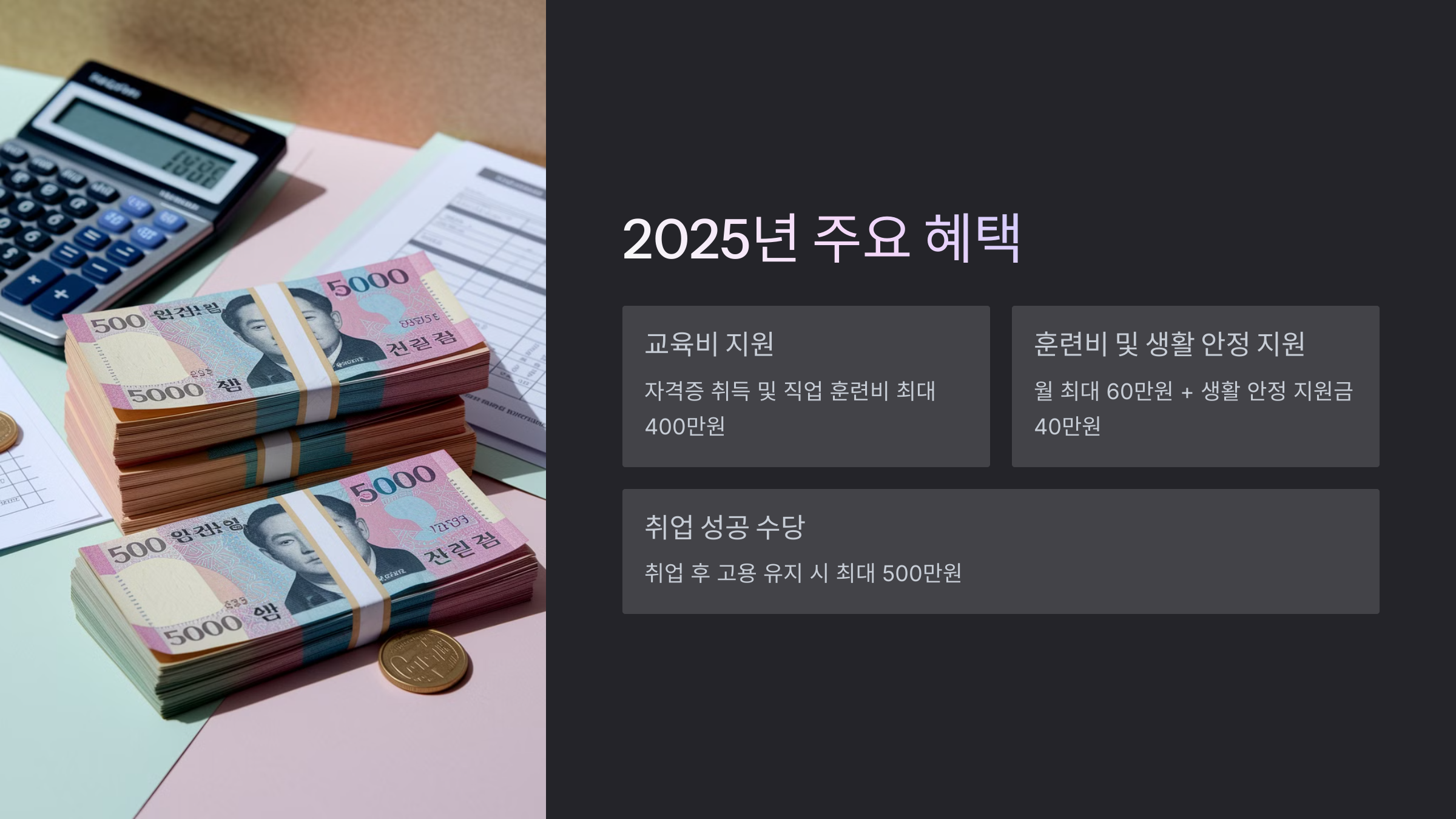 | 훈련비 및 생활 안정 지원 | 교육 참여 시 월 최대 60만 원, 생활 안정 지원금 월 40만 원 | 월 60만 원 + 40만 원 |