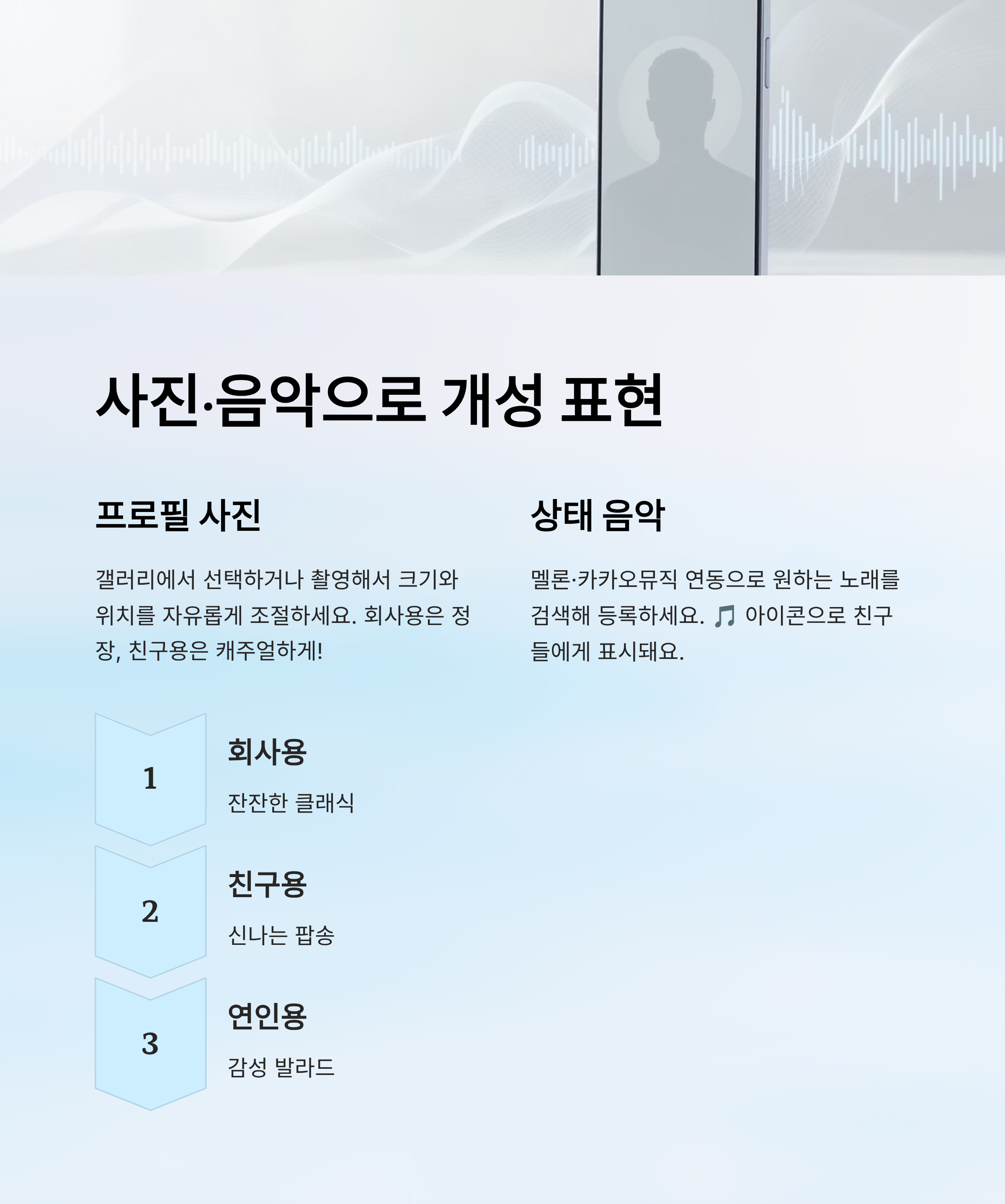 예를 들어, 회사용 프로필 하나, 친구용 프로필 하나, 가족용 프로필 하나를 따로 설정할 수 있어요. 각각의 프로필은 프로필 사진, 이름, 상태 메시지, 배경화면, 상태 음악까지 완전히 별도로 구성할 수 있죠.