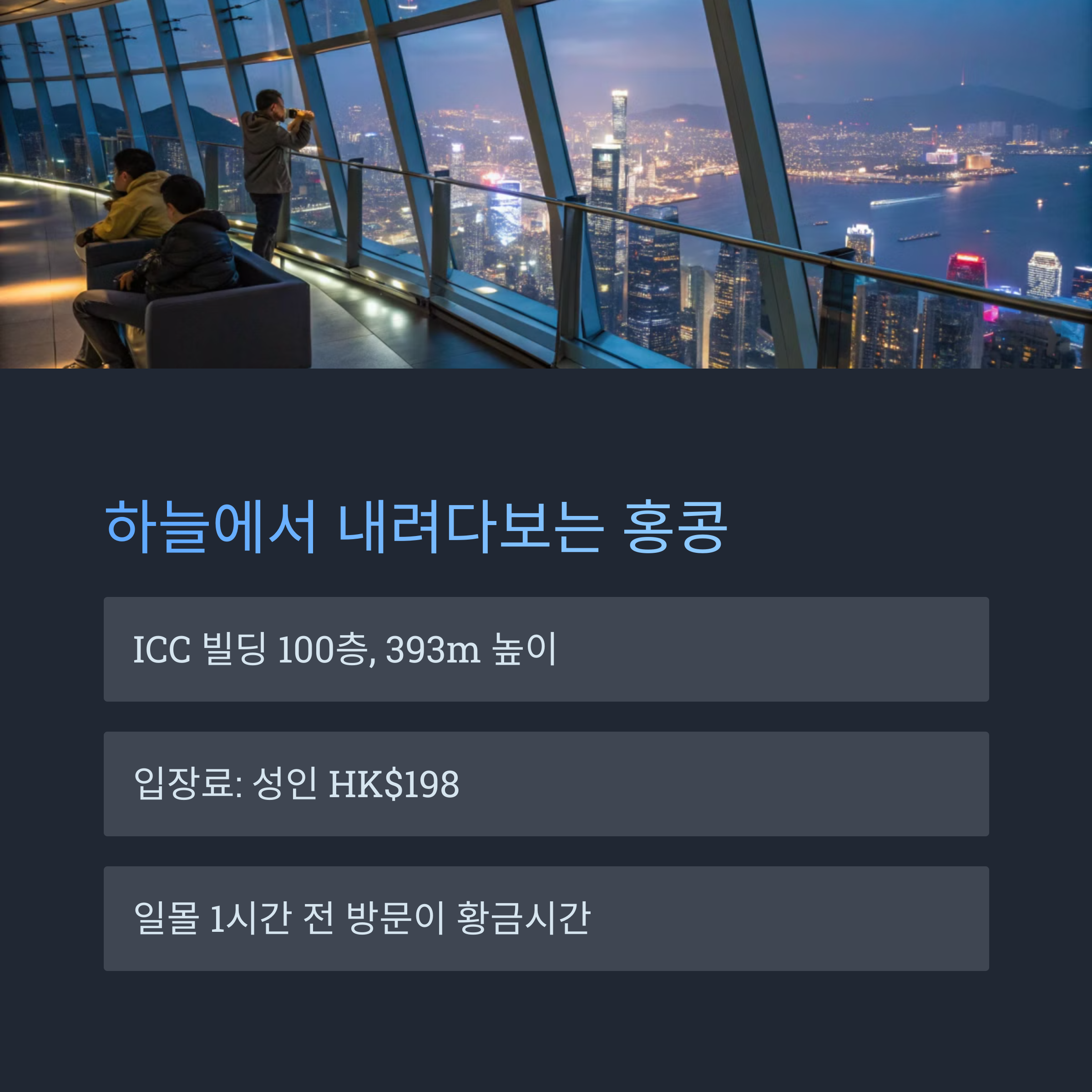 스카이100(Sky100)은 홍콩의 가장 높은 빌딩인 국제상업센터(ICC) 100층에 위치한 전망대예요. 393m 높이에서 360도로 펼쳐지는 홍콩의 전경을 감상할 수 있답니다. 낮과 밤의 풍경이 모두 아름다워요!